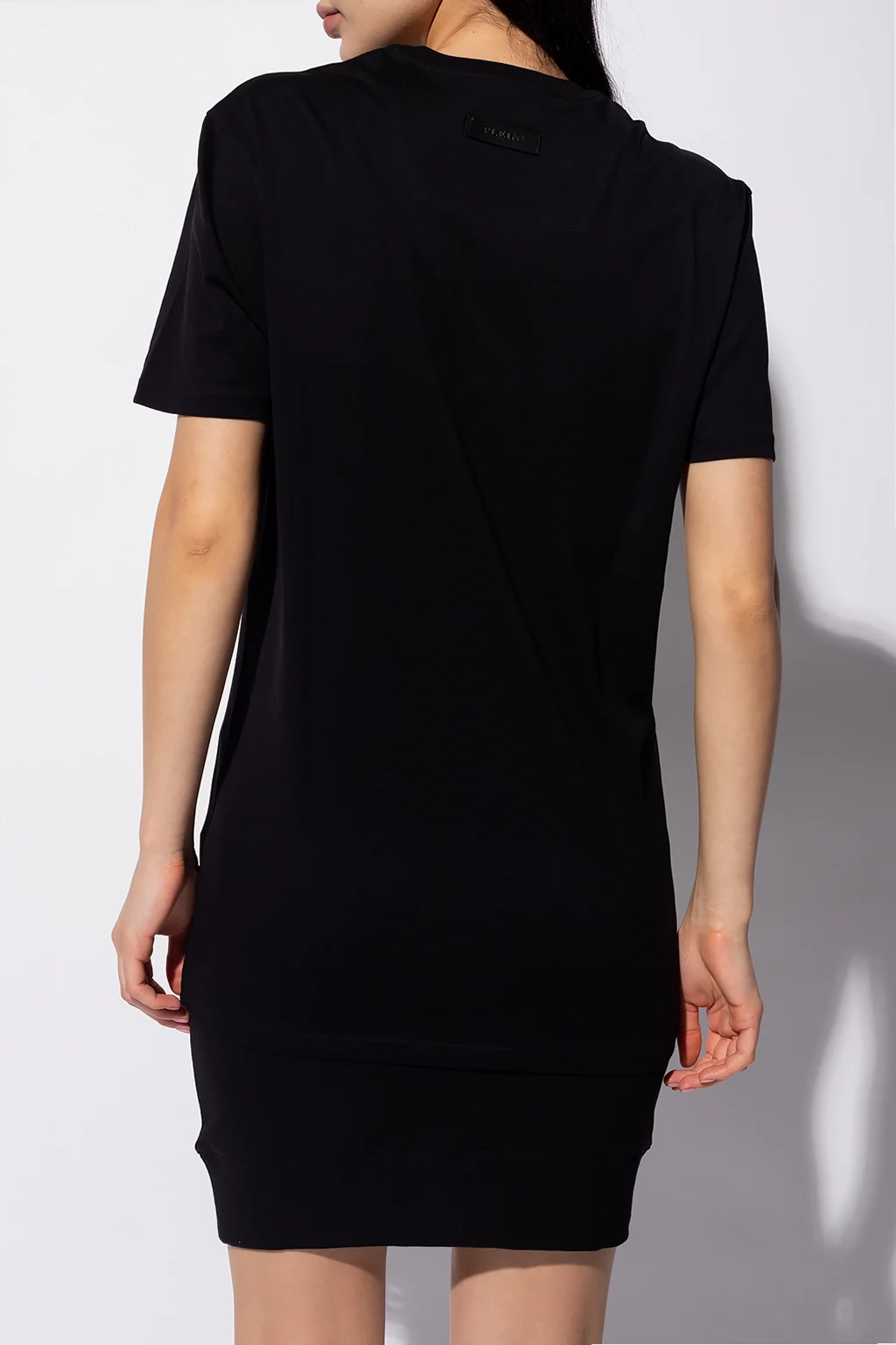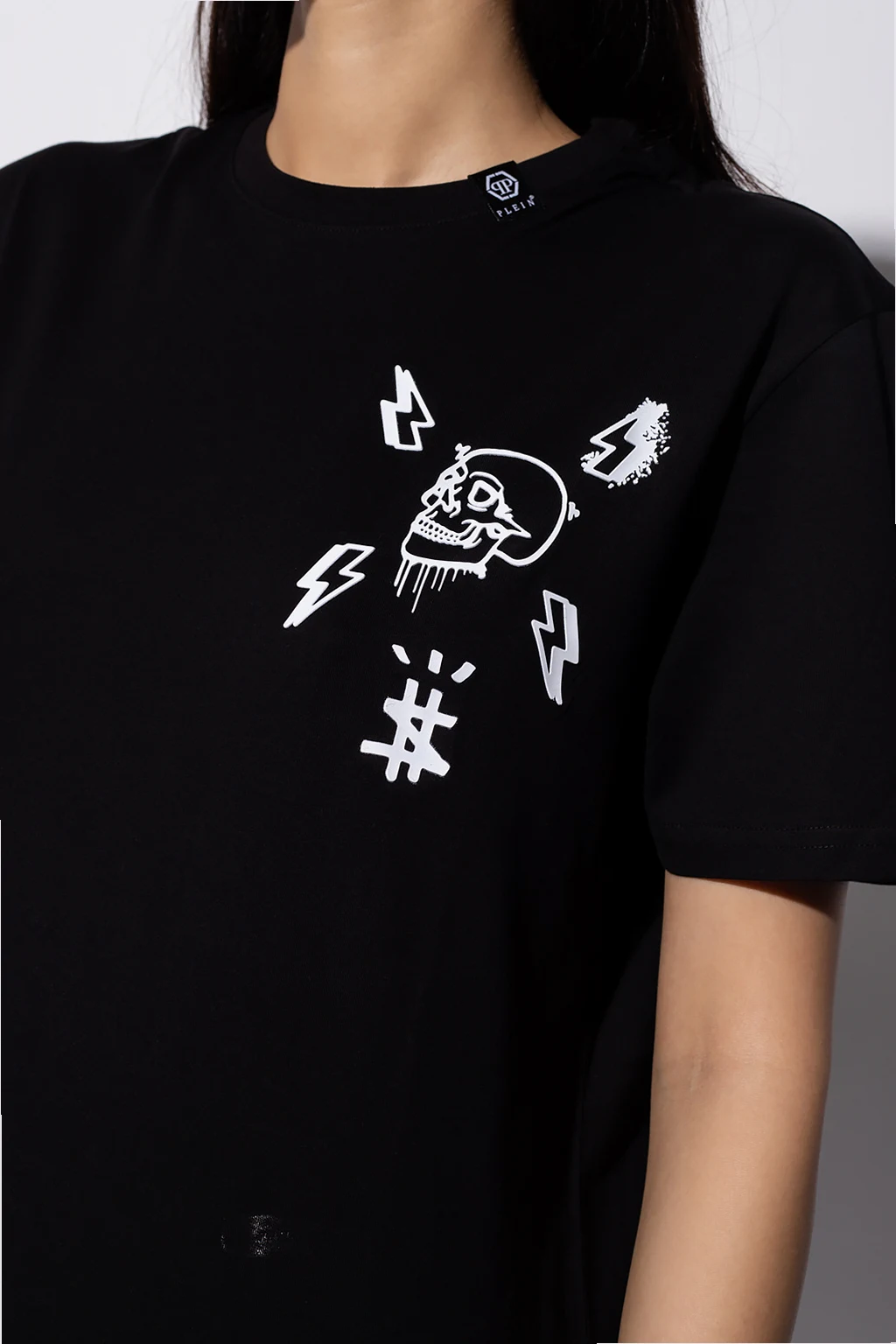 Czarny t-shirt Philipp Plein. Wykonany z bawełny. Ozdobiony białą aplikacją oraz logo. Okrągły dekolt wykończony ściągaczem. Krótkie rękawy.