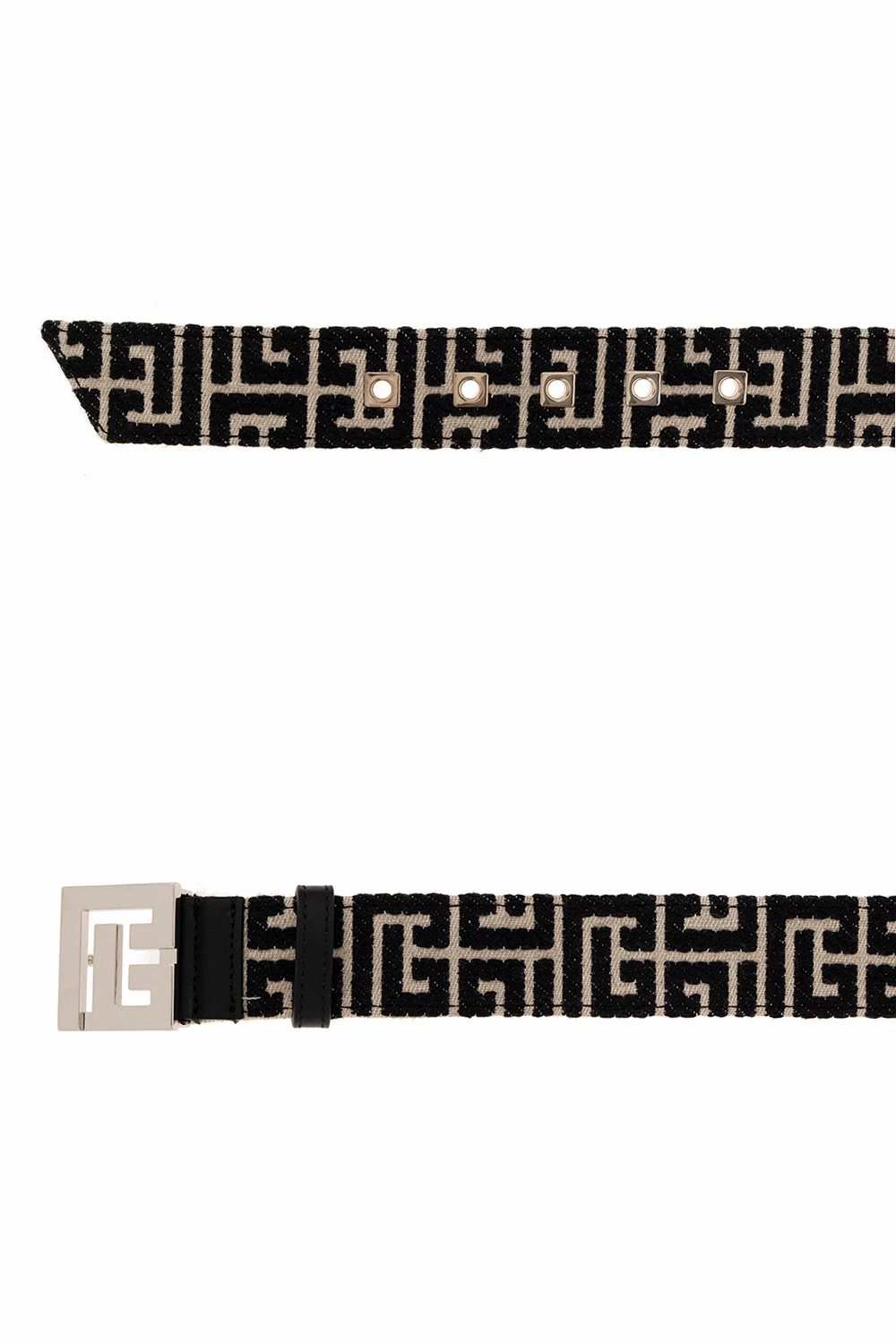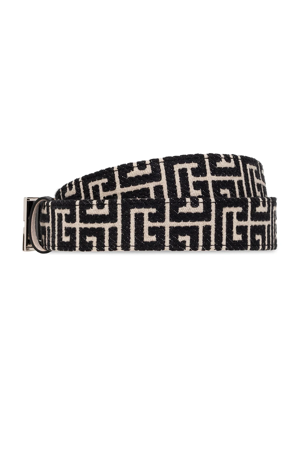 Czarno-kremowy pasek, model ‘B-Classic’ Balmain. Wykonany z materiału ozdobionego żakardowym wzorem z monogramem oraz wykończony skórą. Zapinany na metalową klamrę w kształcie logo w kolorze srebrnym.