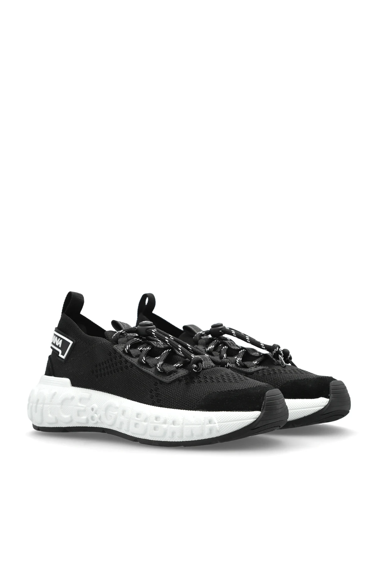 Buty sportowe z logo Dolce & Gabbana Kids to wyrafinowana interpretacja klasycznych sneakersów, dedykowana młodym miłośnikom stylu. Zachwycają czarną, monokolorystyczną cholewką o lekkim opływowym kształcie, wyróżniającą się przewiewną, tekstylną siateczką, która zapewnia doskonałą cyrkulację powietrza. Nowoczesny fason, z charakterystycznie zaokrąglonym noskiem oraz subtelnymi, syntetycznymi wzmocnieniami na pięcie i w okolicach palców, gwarantuje trwałość oraz komfort noszenia.
