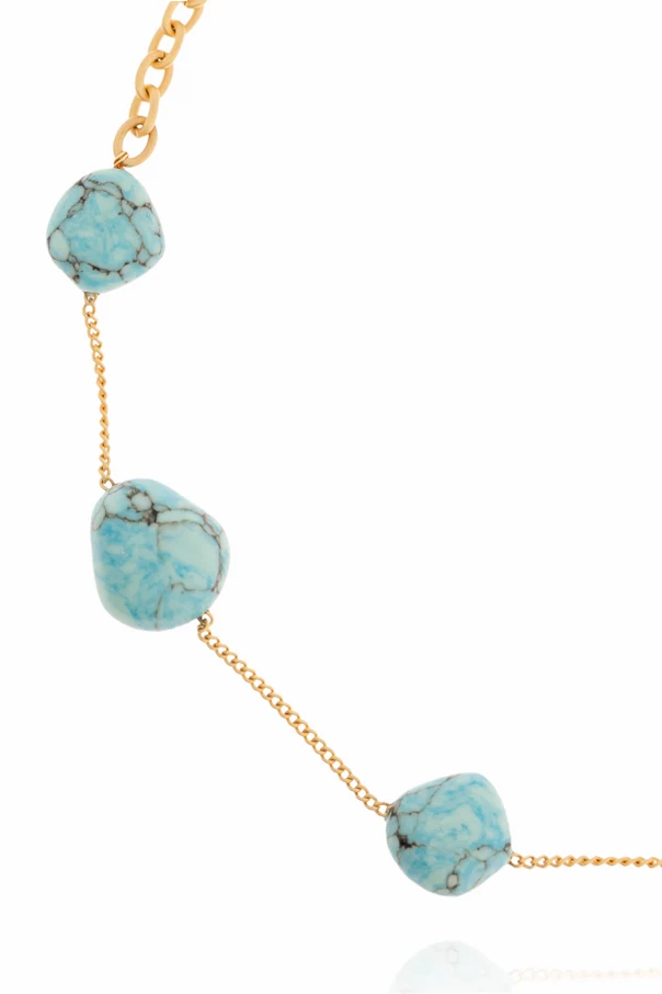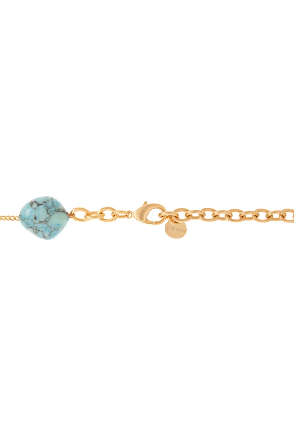 Choker "Andie" marki Cult Gaia emanuje wysublimowaną prostotą, czyniąc z niego perłę współczesnej biżuterii. Klasyczny choker o minimalistycznej formie blisko otula szyję z wdziękiem, bazując na delikatności złotego łańcuszka, na którym równomiernie rozmieszczone zostały kamienie w kolorze turkusowym.