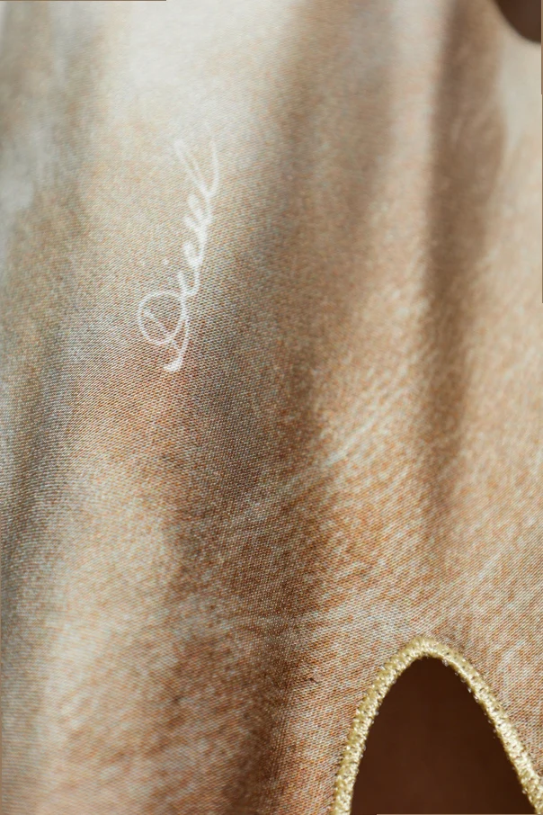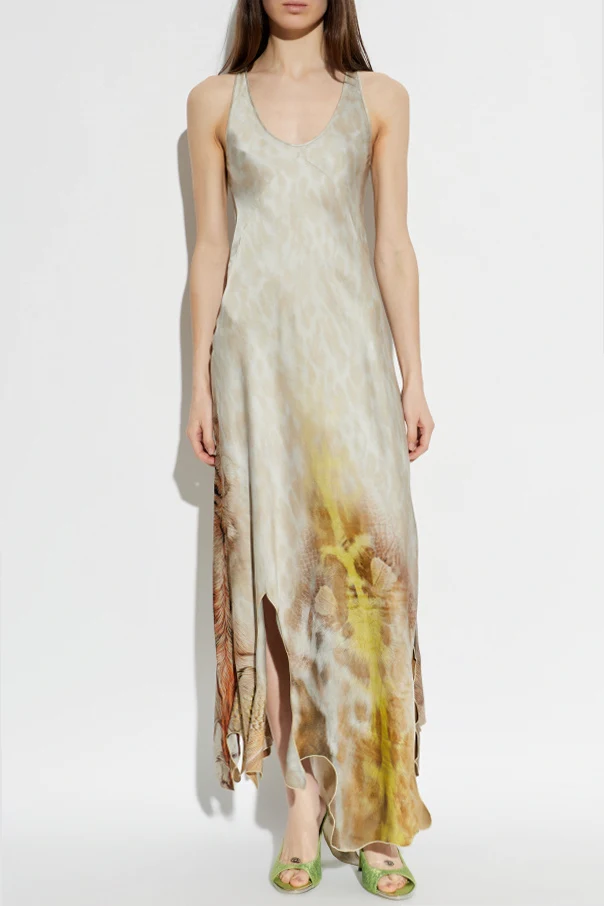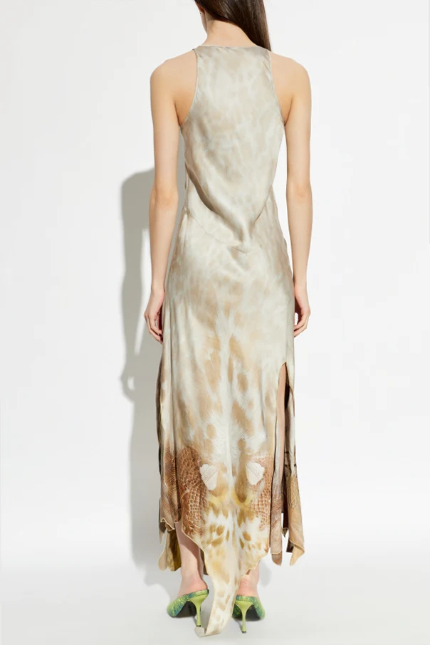 Całość okrywa szary print o abstrakcyjno-roślinnym charakterze, ożywiony tonami żółci i ciepłego brązu, subtelnie imitujący naturalne faktury. Lśniąca, doskonałej jakości wiskoza zapewnia delikatne, lejące układanie, podkreślając luksusowy rodowód sukienki. Ozdobne wycięcia oraz swobodne rozporki nadają sylwetce dynamiki i świeżości.