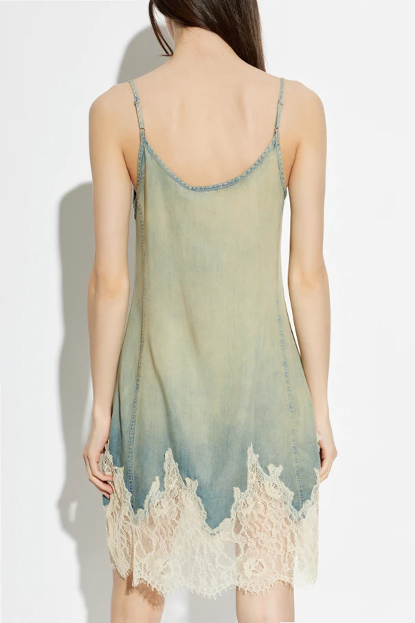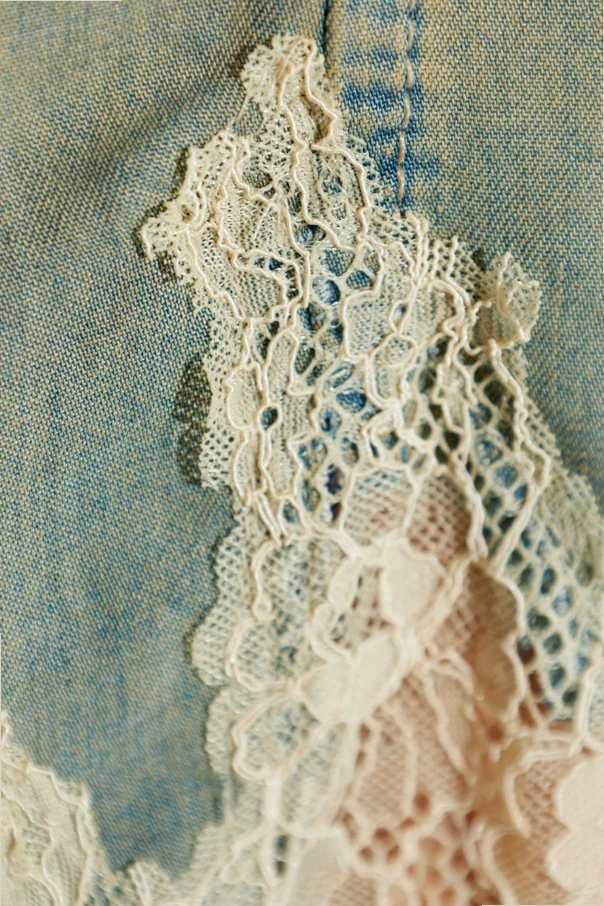 Niebieski, lekko postarzany materiał o denimowym wyglądzie z płynnym przejściem tonów tworzy szlachetną bazę, którą u dołu zdobi szeroki, koronkowy pas w odcieniu ecru. Ten wyrazisty detal nadaje sukience ekskluzywnego wyrazu i artystycznego sznytu. Dodatkowym akcentem jest niewielkie, metalowe logo projektanta przy dekolcie, świadczące o autentyczności oraz wyjątkowości produktu.