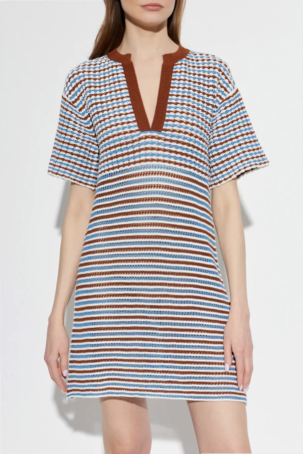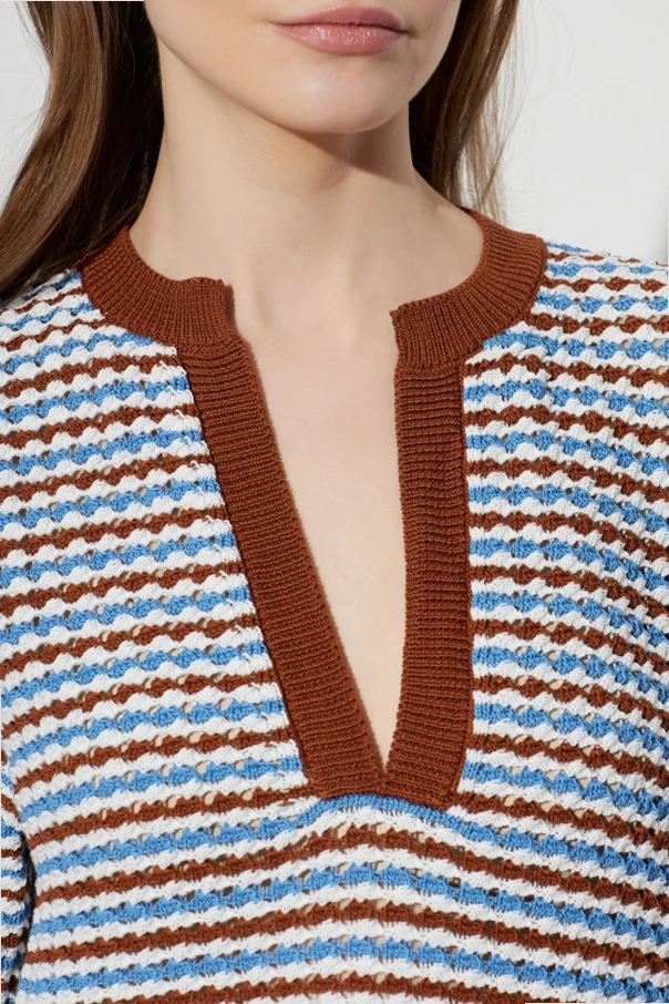 Charakterystycznym elementem pozostaje regularny wzór w poziome paski , w barwach takich jak biały, błękitny oraz brązowy, co współtworzy wyjątkowy, multikolorowy efekt. Uwagę przyciąga wyrazisty dekolt w kształcie litery V z szeroką brązową lamówką, stanowiący o oryginalności projektu. Subtelne wykończenie bez nadmiaru ozdób podkreśla czystą formę oraz dbałość o detale, z których znana jest marka Marni.