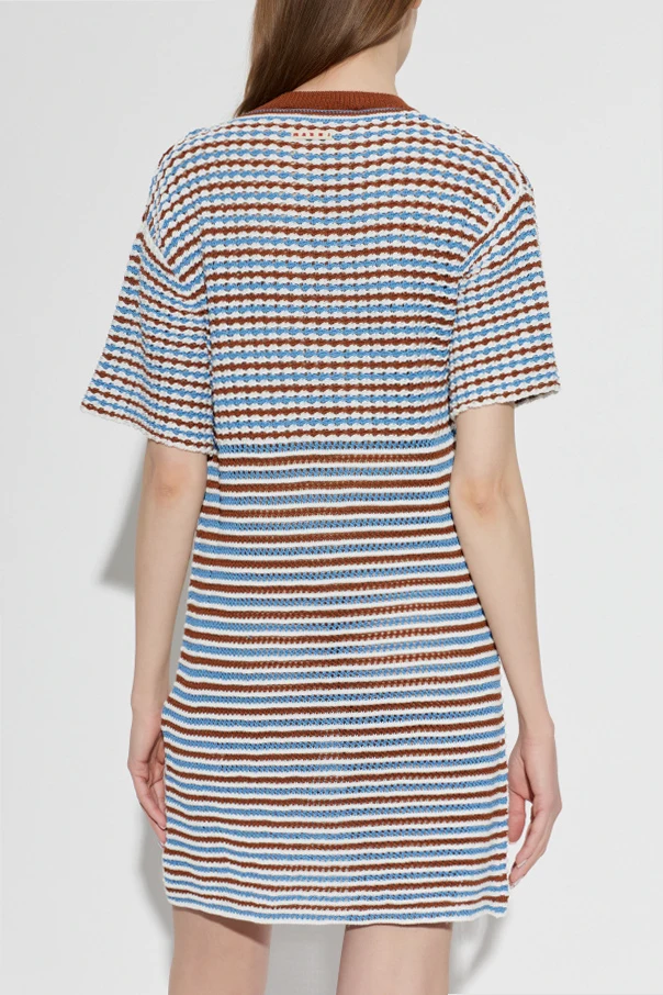 Sukienka ze wzorem w paski marki Marni emanuje wyrafinowaną nonszalancją i świeżością włoskiego designu. Swobodny, krótki krój sięgający do połowy uda oraz lekko luźne, krótkie rękawy gwarantują komfort i podkreślają kobiecy wdzięk. Zastosowanie mięsistej bawełny o wyrazistej fakturze czyni ten model przyjemnym w dotyku i doskonałym na ciepłe dni.