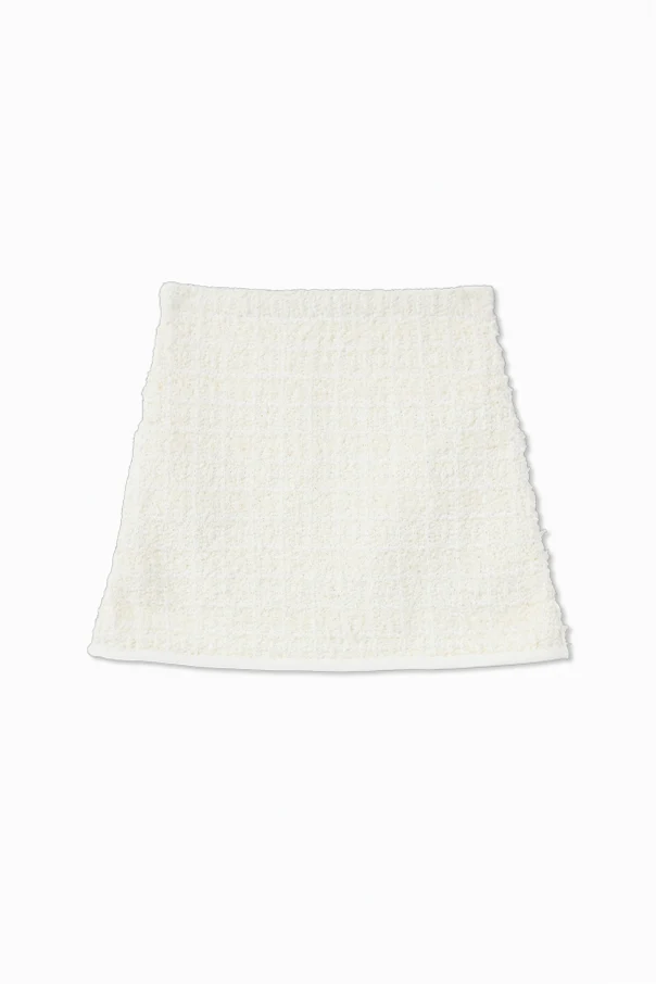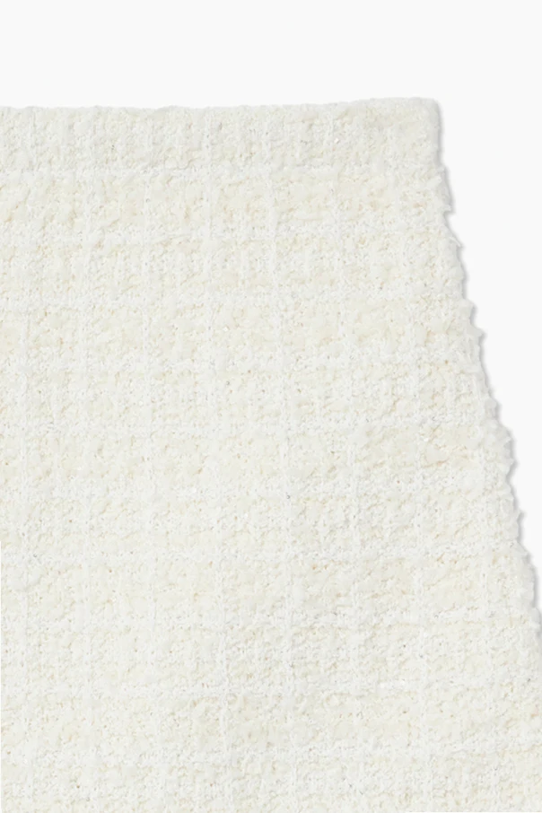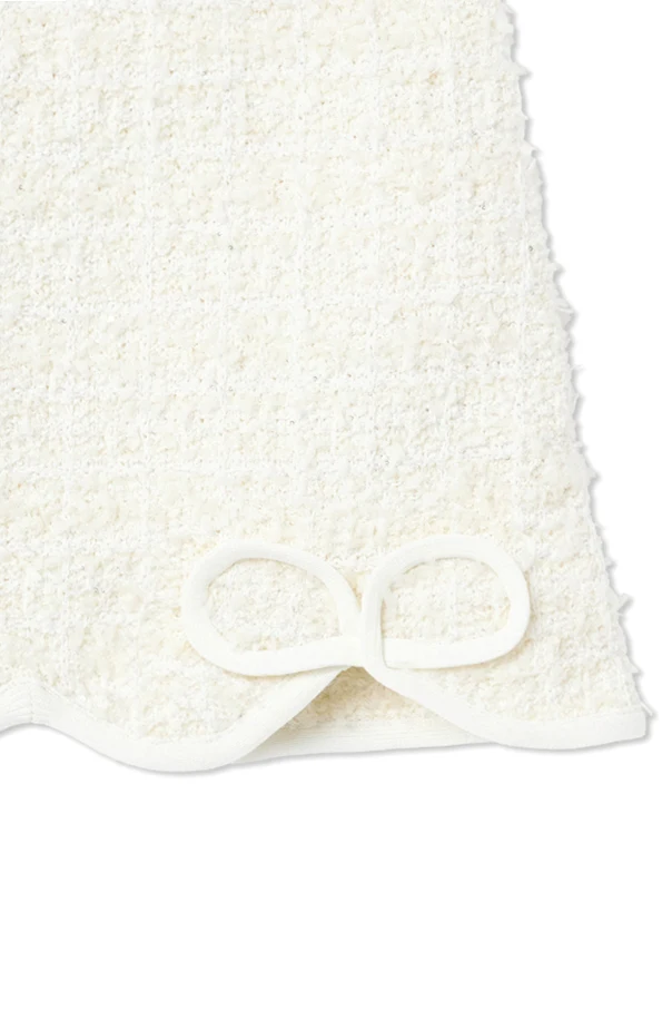 Materiał o wyraźnej, miękkiej strukturze – inspirowany szlachetnym tweedem lub bouclé – tworzy unikatową powierzchnię o ponadczasowej elegancji. Spódnica utrzymana jest w jednolitej kolorystyce, pozbawionej wzorów, co doskonale wpisuje się w estetykę haute couture. Uwagę przyciągają również dwie subtelne kokardki, harmonijnie wkomponowane przy dolnej krawędzi.