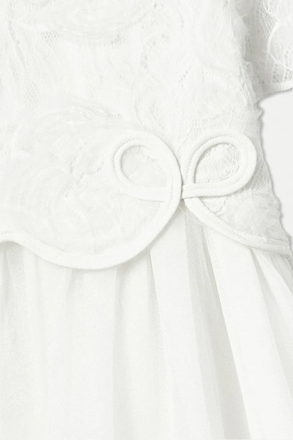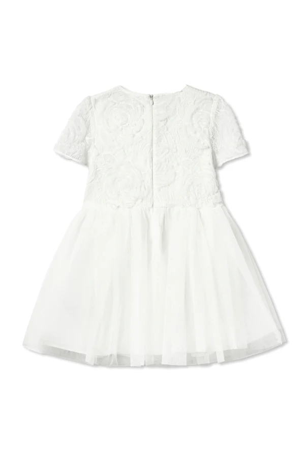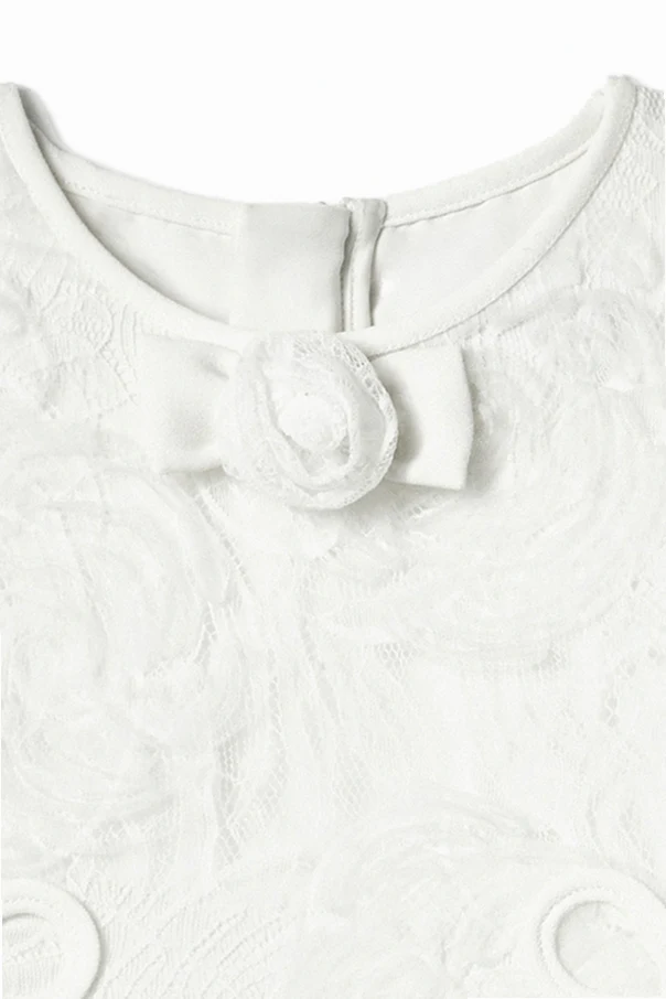 Sukienka z kokardą to esencja wykwintnej elegancji stworzona z myślą o najmłodszych miłośniczkach szyku. Zachwyca śnieżnobiałym kolorem, który subtelnie podkreśla jej czystość oraz wyjątkowość. Góra sukienki ujmuje wdziękiem dzięki tkaninie okrytej koronką o tłoczonym, kwiatowym wzorze – zaś rozkloszowany, warstwowy dół z eterycznego tiulu dodaje każdemu ruchowi niezwykłej lekkości.