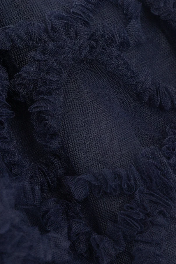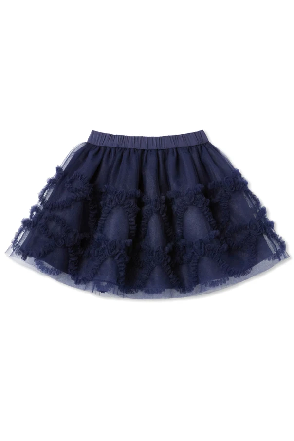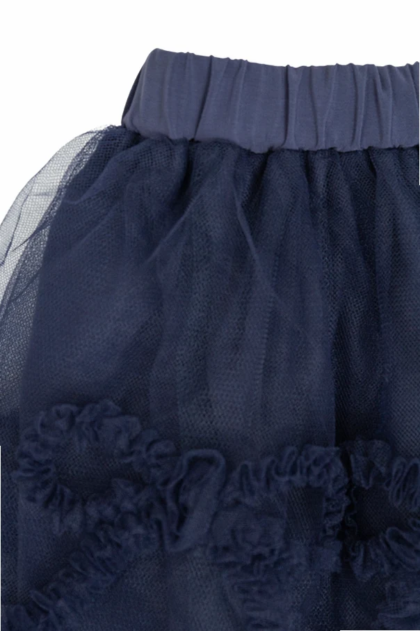 Swą unikatowość zawdzięcza ozdobnym aplikacjom z tiulowych falbanek , które w fantazyjny sposób zdobią całą powierzchnię spódnicy, nadając jej dynamiczny i ekskluzywny charakter.