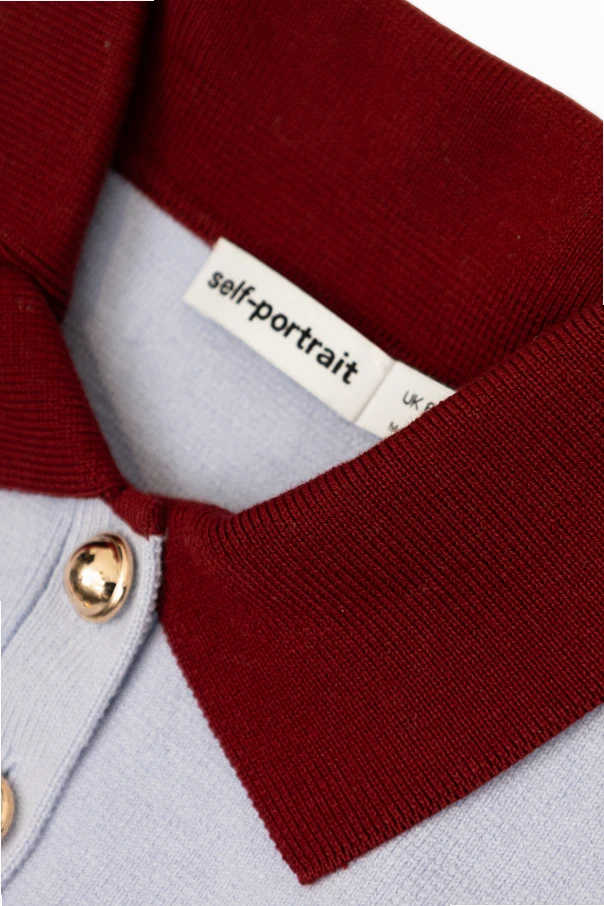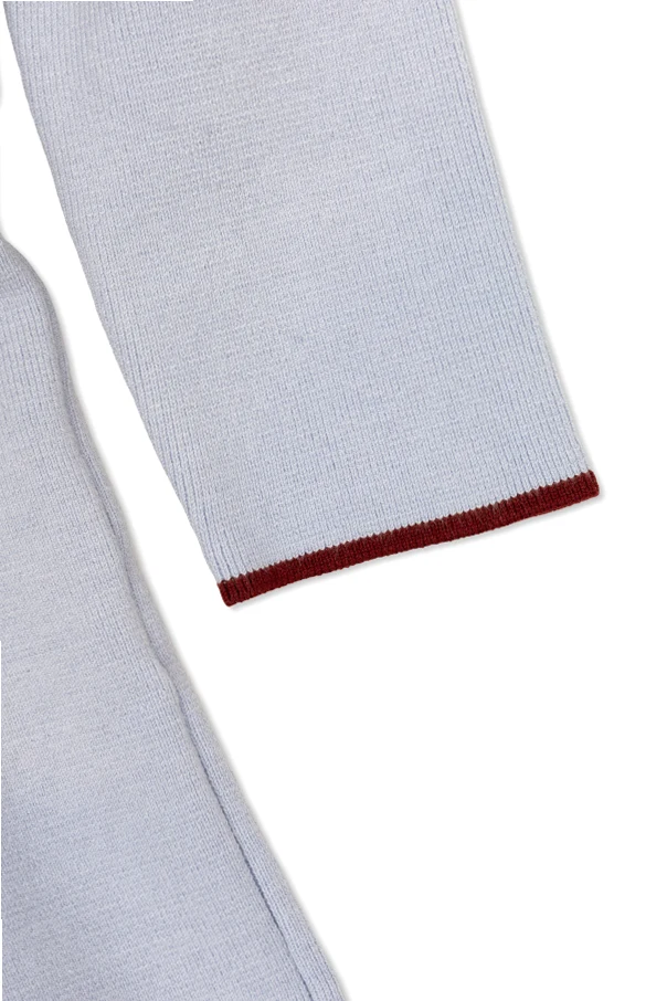 Jasnoniebieski odcień harmonijnie współgra z głębokim bordo kołnierzyka, lamówek oraz detali przy imitacjach kieszonek, dopełnionych złotymi guzikami. Długi rękaw oraz gładki, jednolity wzór wyrażają subtelny luksus codziennych stylizacji. Krótkie rozcięcie na przodzie, zapinane na ozdobne guziki, podkreśla dbałość o szczegół każdego elementu.