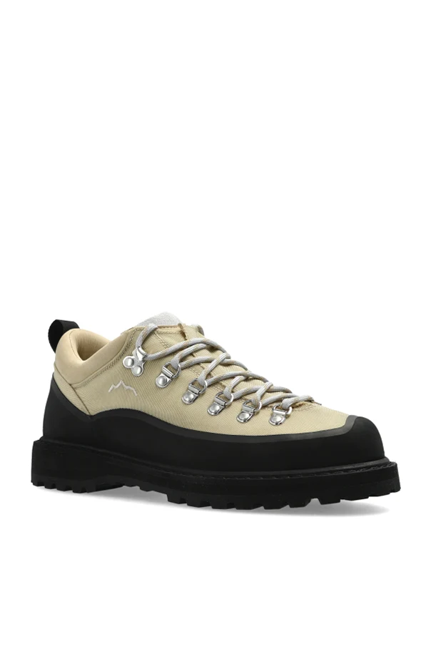 Buty Roccia Basso zachwycają przemyślaną formą i wyważoną estetyką, łącząc wyrafinowaną lekkość niskiej cholewki z solidnością masywnej bryły oraz wyrazistym, szerokim noskiem. Dominujący, beżowy odcień wysokogatunkowej skóry i wyselekcjonowanego materiału tworzy harmonijną, jednolitą powierzchnię, podkreśloną subtelną fakturą zamszu.