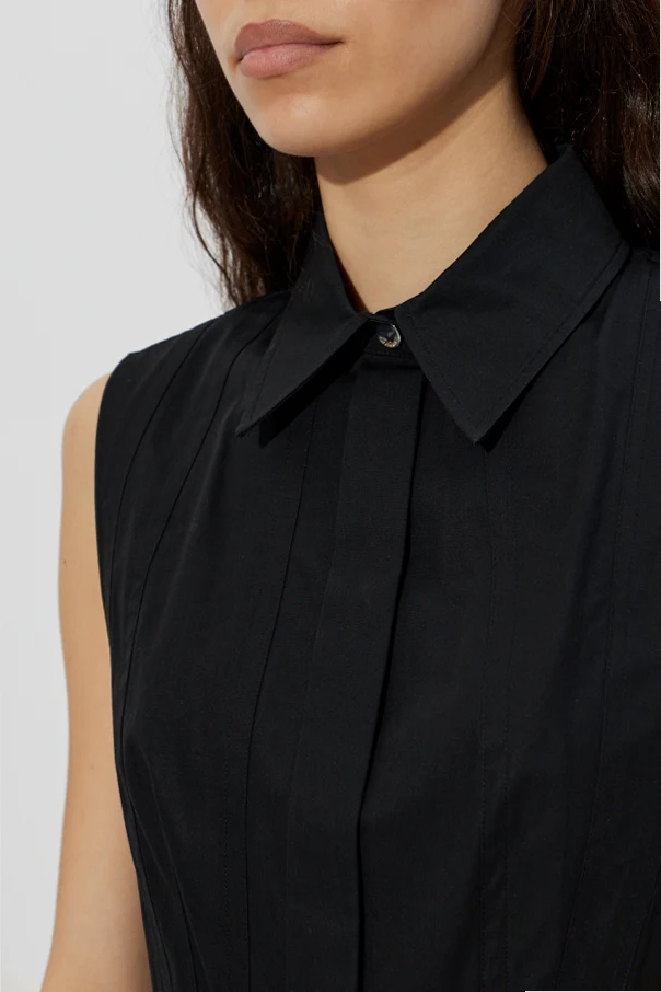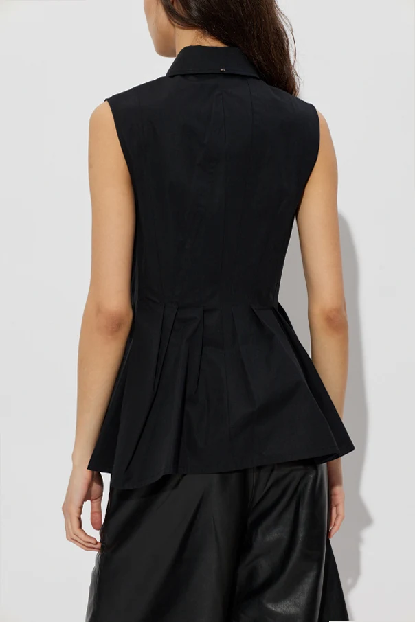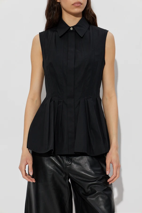 Projekt wyróżnia się klasycznym kołnierzem koszulowym z pojedynczym, dekoracyjnym guzikiem oraz ukrytym zapięciem na guziki pod plisą, co zachowuje minimalistyczny, luksusowy charakter. Dzięki strukturze i wykorzystanym materiałom ten top zachwyca nie tylko estetyką, ale także komfortem noszenia.