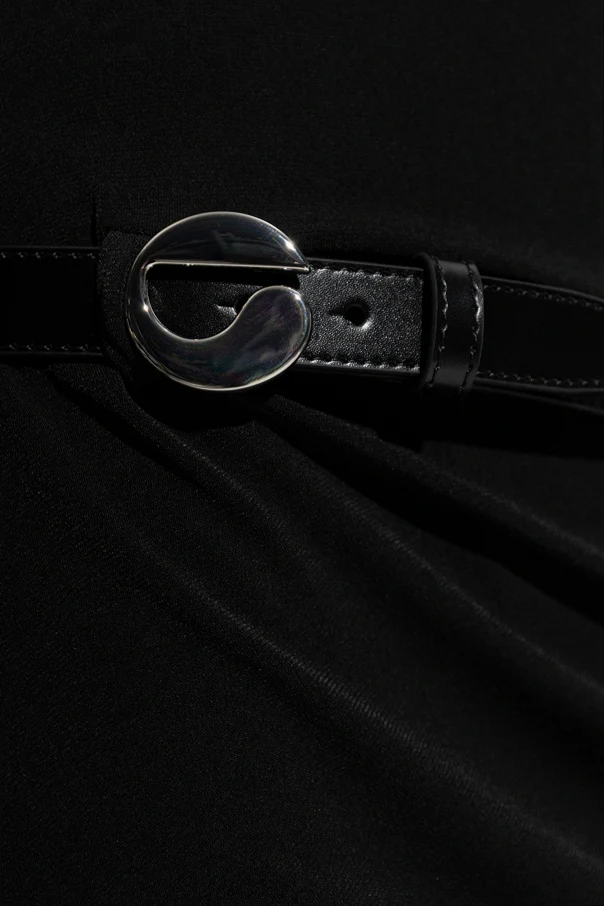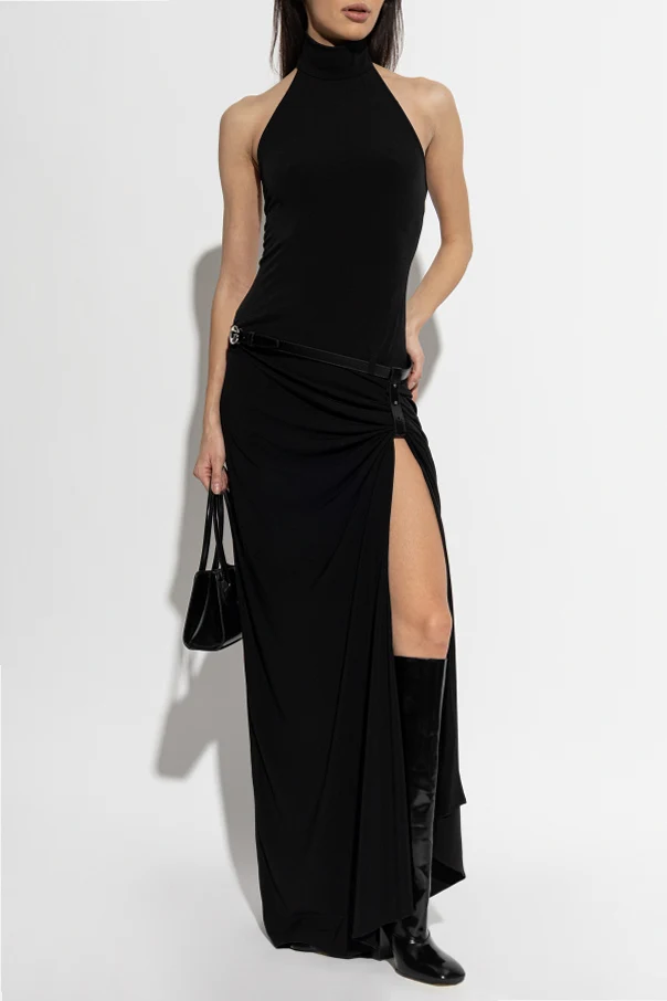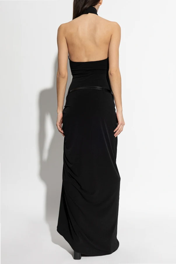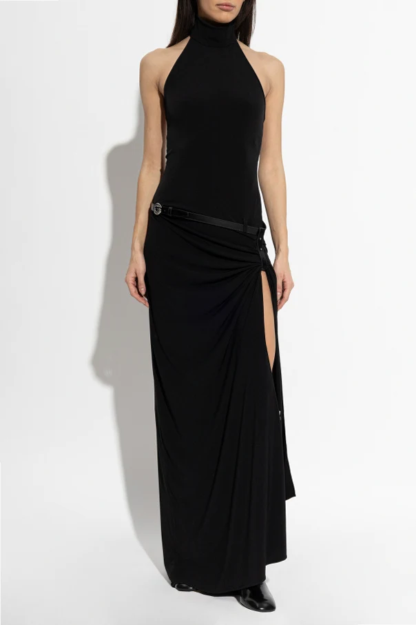 Sukienka z odkrytymi plecami i golfem marki Coperni to kwintesencja współczesnej elegancji osadzona w duchu architektonicznego minimalizmu. Jej długi, przylegający krój subtelnie modeluje sylwetkę, gwarantując wyrafinowany efekt wizualny. Jednolita, czarny kolor nadaje kompozycji ponadczasowej klasy.