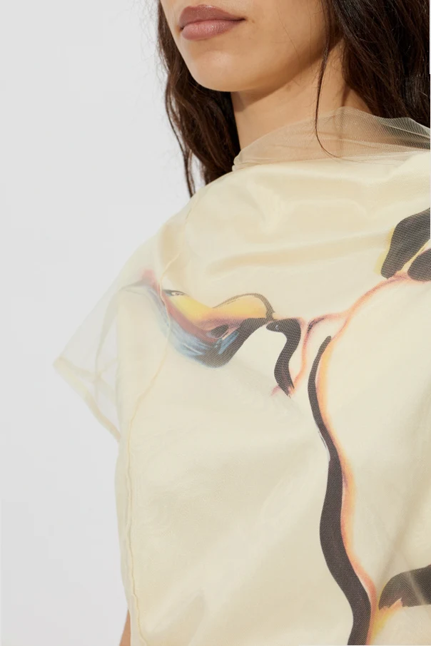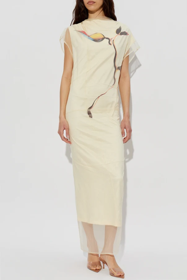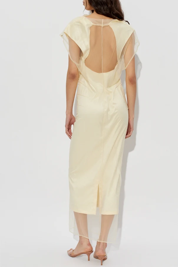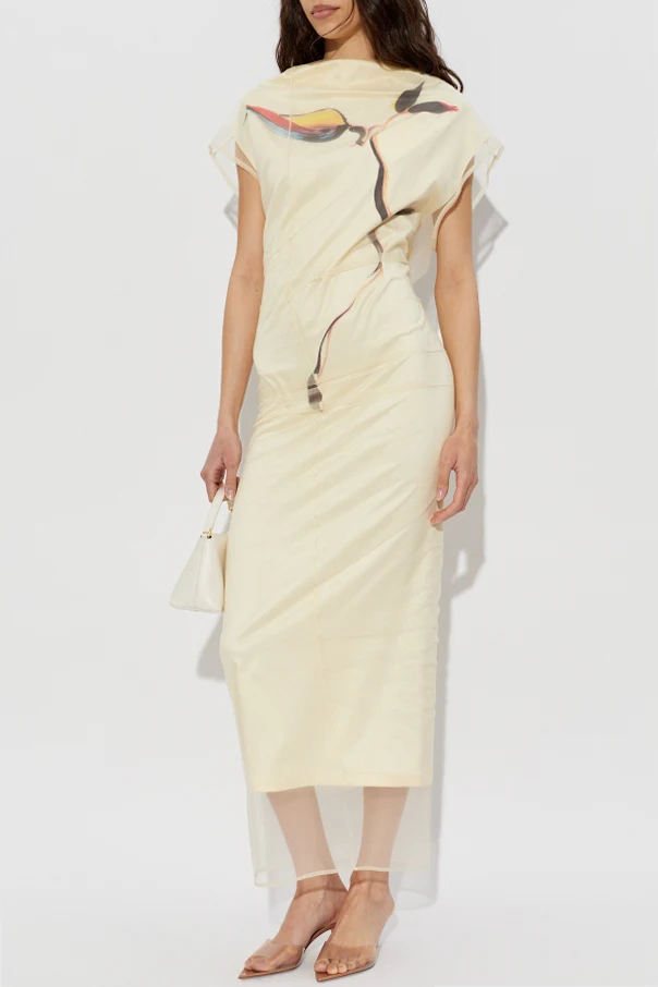 Sukienka Viale autorstwa renomowanej marki Sportmax zachwyca wyrafinowaną formą oraz rzadko spotykanym połączeniem funkcjonalności z artystyczną ekspresją. Utrzymana w żółtym tonie, długością sięga połowy łydki, tworząc sylwetkę eteryczną i pełną wdzięku. Subtelna struktura materiału, przypominająca warstwowy tiul lub organzę, połyskuje delikatnym blaskiem, potęgując luksusowy charakter kreacji.