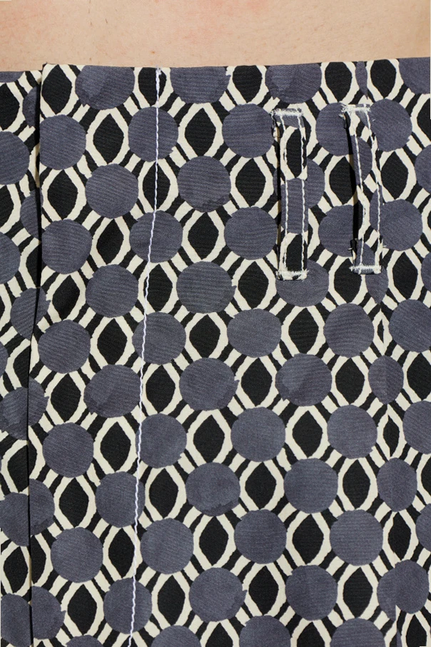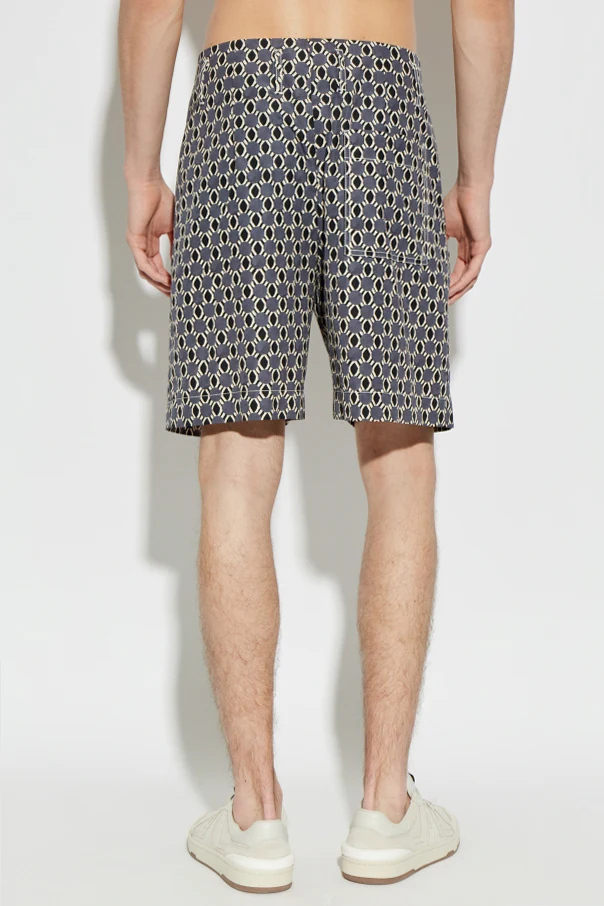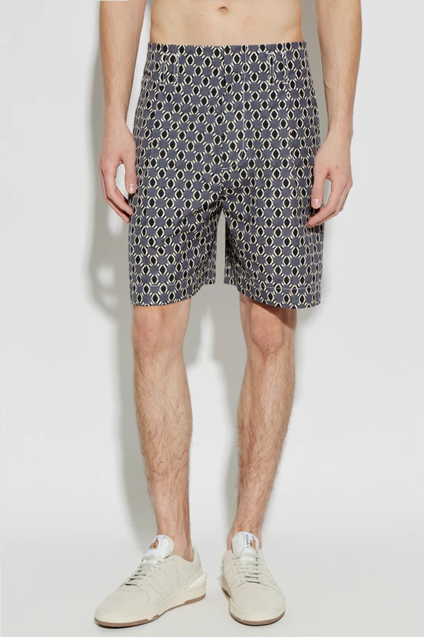 Wzorzyste szorty marki Lanvin to wyraz ponadczasowego stylu i wyrafinowanej formy. Świetlisty, szary kolor połączony z geometrycznym deseniem subtelnych okręgów i białych rombów kreuje efekt głębi oraz niewymuszonej elegancji. Klasyczna linia, regularny stan oraz proste, lekko luźne nogawki zapewniają swobodę i komfort noszenia, zachowując jednocześnie harmonijną sylwetkę.