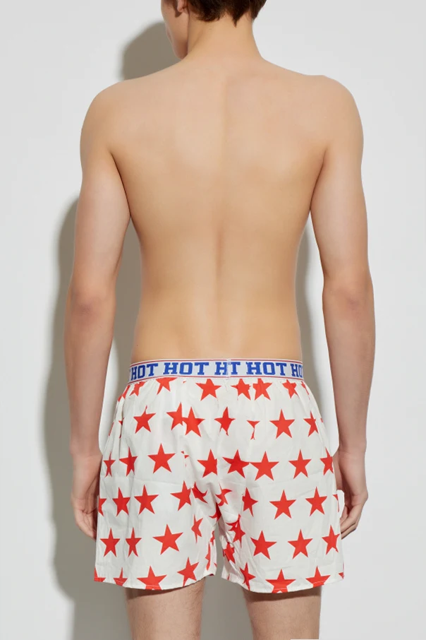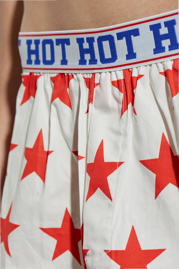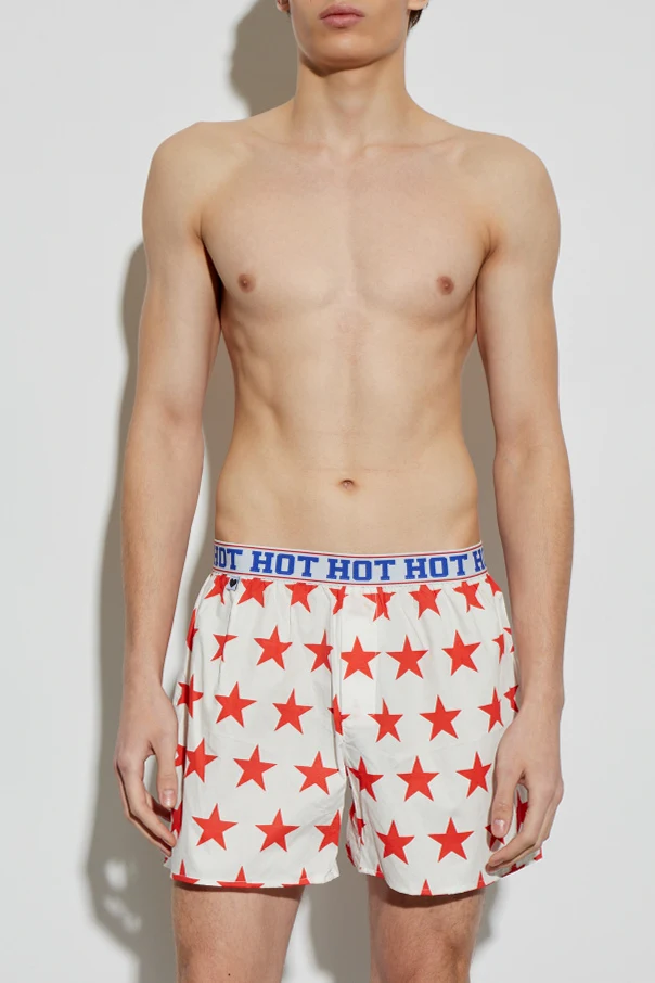 Nawierzchnia bokserków zdobiona jest wyrazistym motywem dużych czerwonych gwiazd , co nadaje całości dynamicznego, nowoczesnego charakteru. Zdecydowanym akcentem jest szeroka, elastyczna guma w pasie w kolorze białym, z powtarzającym się niebieskim napisem „HOT HOT HOT HOT”, tworzącym unikatowy detal estetyczny. Multikolorowa kompozycja przyciąga wzrok i wyraża indywidualność.