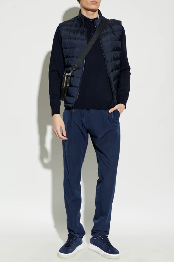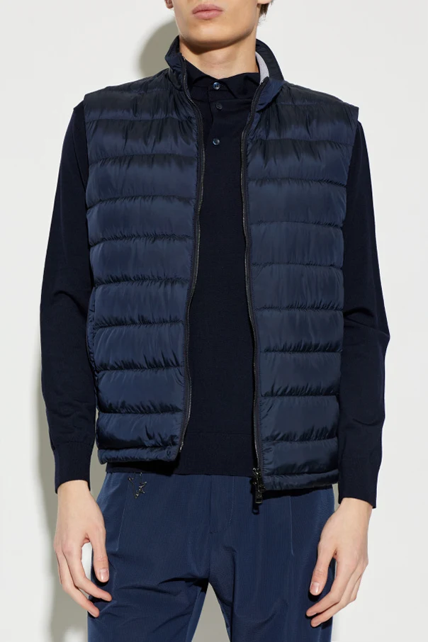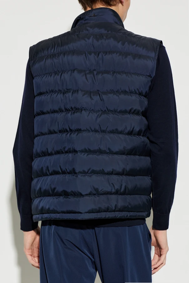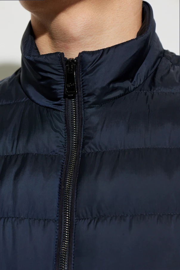 Wykonana z granatowej , subtelnie połyskującej tkaniny syntetycznej o właściwościach wodoodpornych, kamizelka wyróżnia się sportowymi, poziomymi przeszyciami stabilizującymi szlachetne puchowe wypełnienie. Dwustronny, centralny suwak pozwala na komfortowe użytkowanie, podczas gdy brak widocznego logo podkreśla jej minimalistyczny, ekskluzywny charakter .