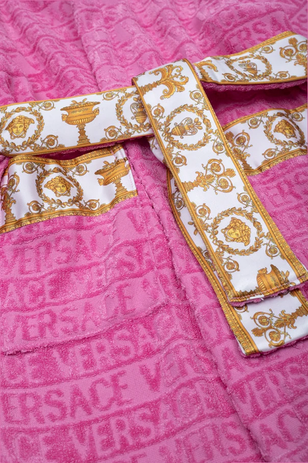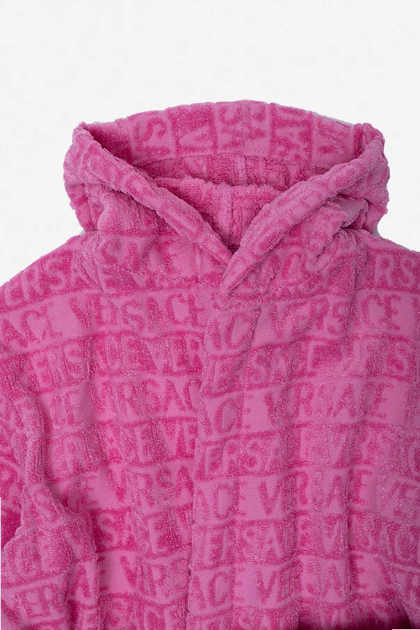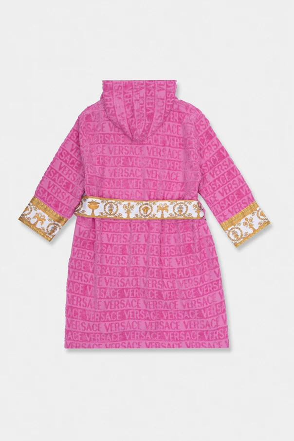 Różowy szlafrok z kapturem Versace Kids. W talii pasek. Ozdobiony wypukłym monogramem. Biało-żółte materiałowe wstawki z charakterystycznym nadrukiem ‘Barocco’. Z przodu dwie kieszenie. Długie rękawy.