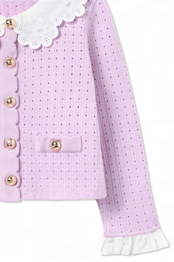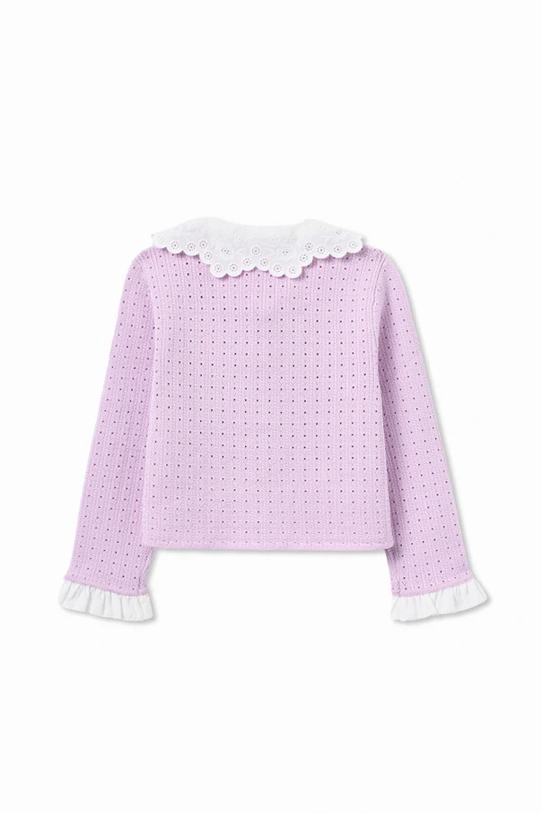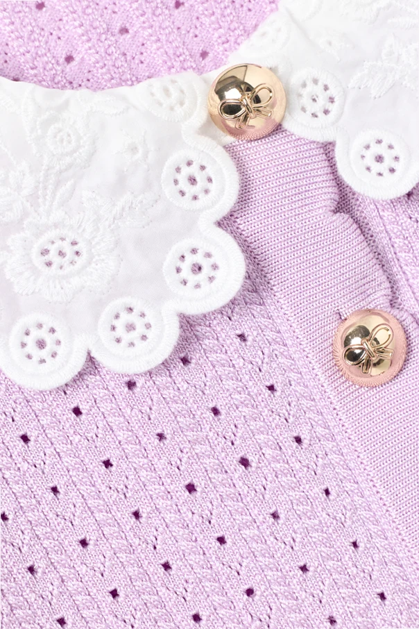 Ażurowy kardigan marki Self-Portrait Kids to synonim wyrafinowanej elegancji w dziecięcej odsłonie. Utrzymany w subtelnym fiołkowym odcieniu, wykonany został z mistrzowsko wykończonej, miękkiej dzianiny, zapewniającej komfort oraz trwałość. Klasyczny, lekko skrócony krój z długimi rękawami harmonijnie łączy się z misternie wypracowanym ażurowym wzorem, który podkreśla zarówno przewiewność, jak i delikatność całej kompozycji.
