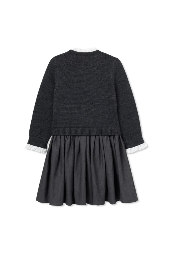 Wełniana sukienka autorstwa Self-Portrait Kids to wyrafinowana propozycja dla młodych koneserek wyszukanej elegancji. Dopasowana góra, inspirowana sweterkiem kardiganem, zapinana jest na subtelne guziki w kolorze perłowej bieli, ozdobione delikatnym, lśniącym akcentem. Szeroki, marszczony dół wprowadza lekkość i swobodę ruchów, zachowując przy tym proporcje klasycznego fasonu.