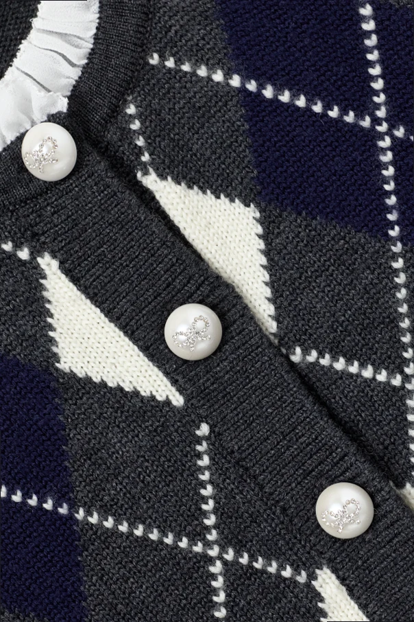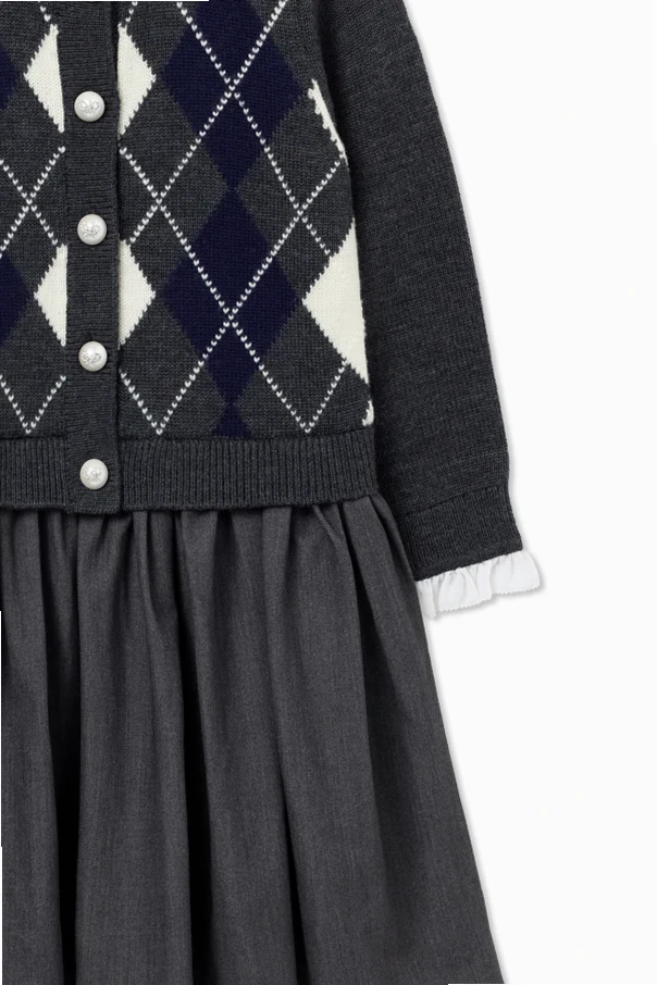 Klasyczny, szary odcień dzianiny wełnianej w połączeniu ze wzorem argyle – zestawionym z granatową i białą tonacją – tworzy subtelny efekt wizualny, podkreślający ekskluzywny charakter kreacji. Miękka struktura materiału gwarantuje komfort noszenia, a wyrafinowane wykończenie świadczy o najwyższej dbałości o detale.