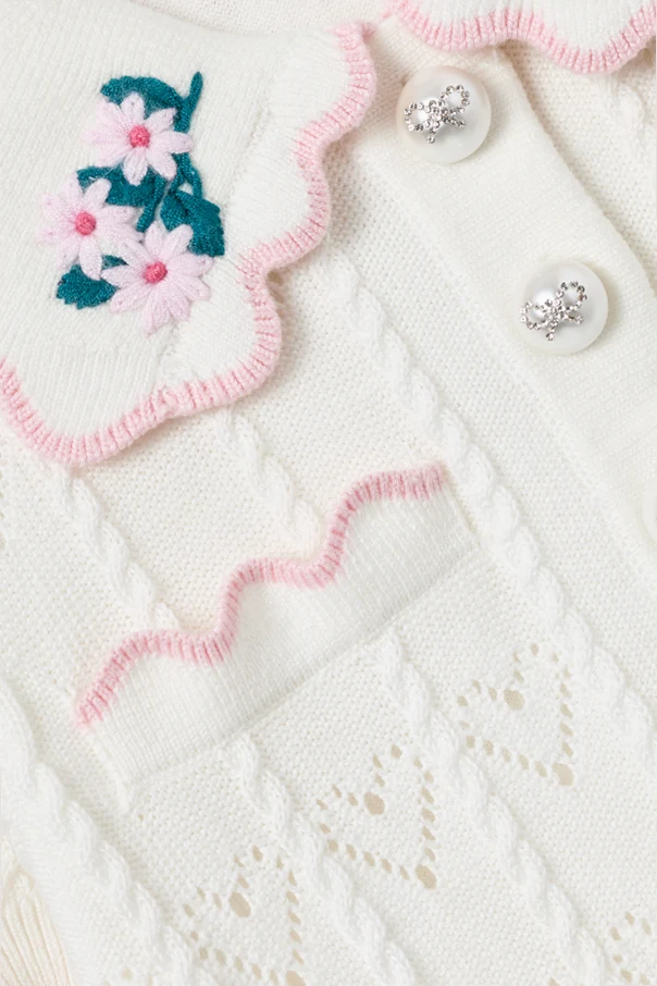 Ażurowa sukienka to synonim dziecięcej elegancji, zaprojektowany z myślą o wyjątkowych chwilach. Wyjątkowa struktura dzianiny o ażurowym splocie, wzbogaconej regularnym motywem w kształcie serc, subtelnie podkreśla jej szlachetny charakter. Sukienka utrzymana jest w kremowym odcieniu, który doskonale współgra z delikatną różową lamówką przy klasycznym kołnierzyku zakończonym falbaną.