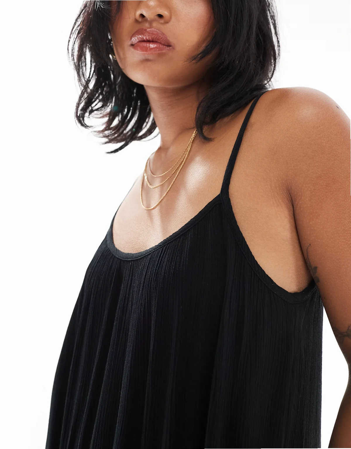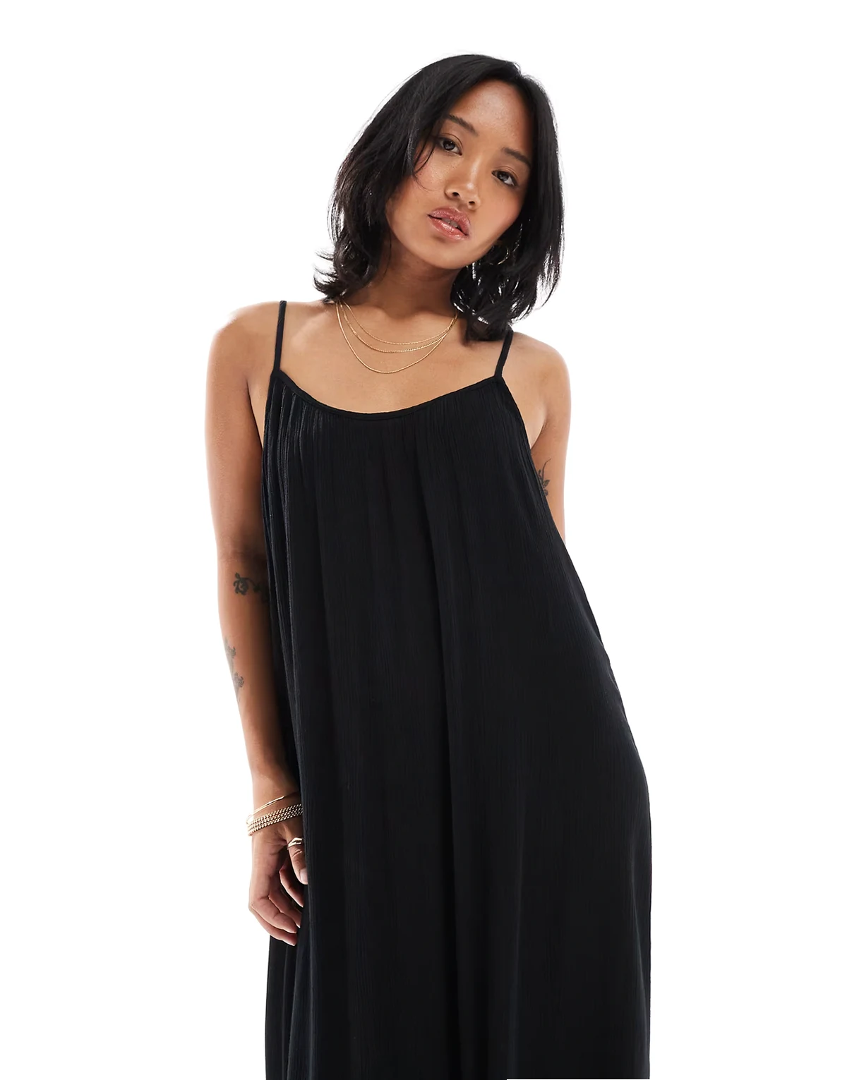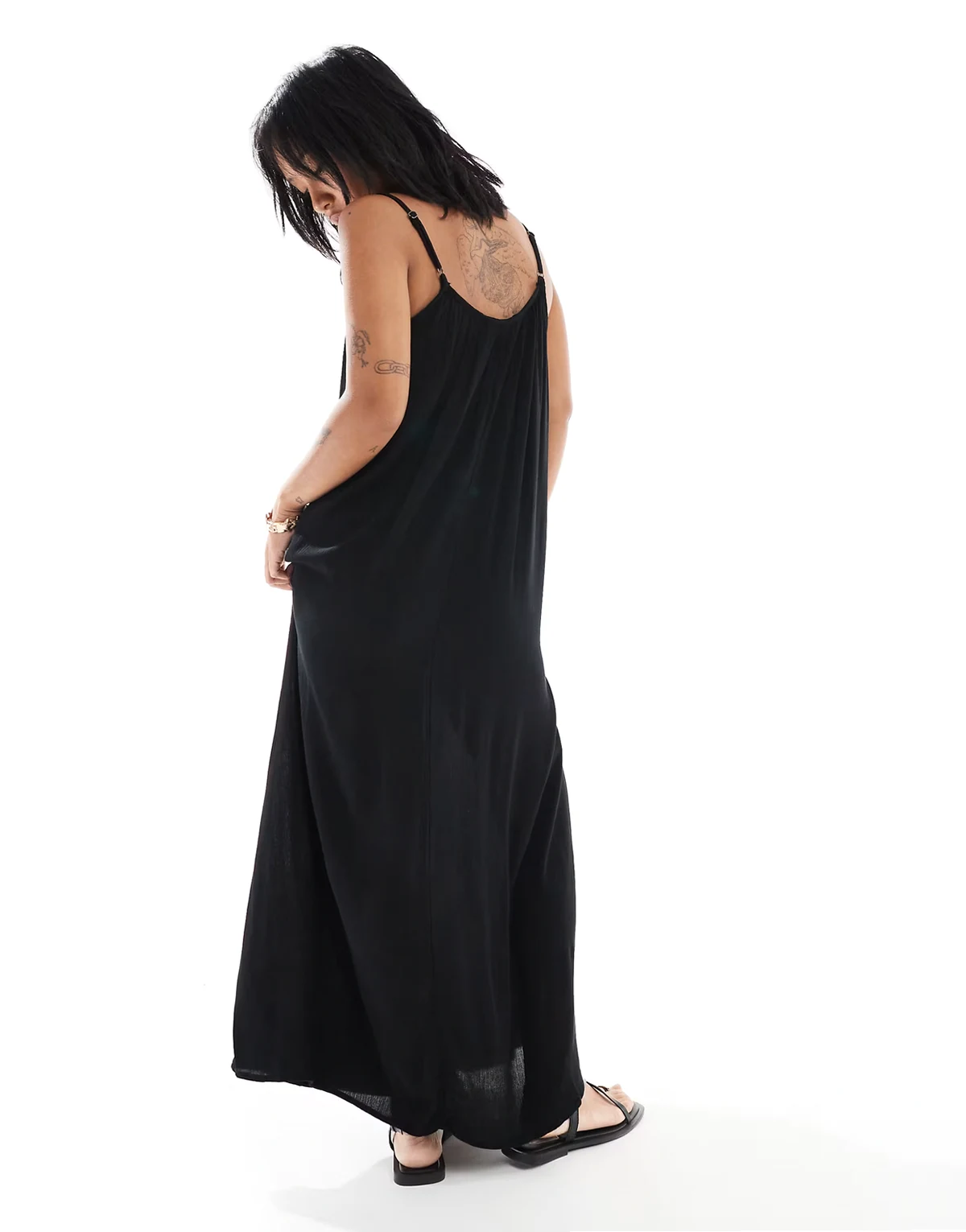 – Teksturowana czarna sukienka maxi na ramiączkach