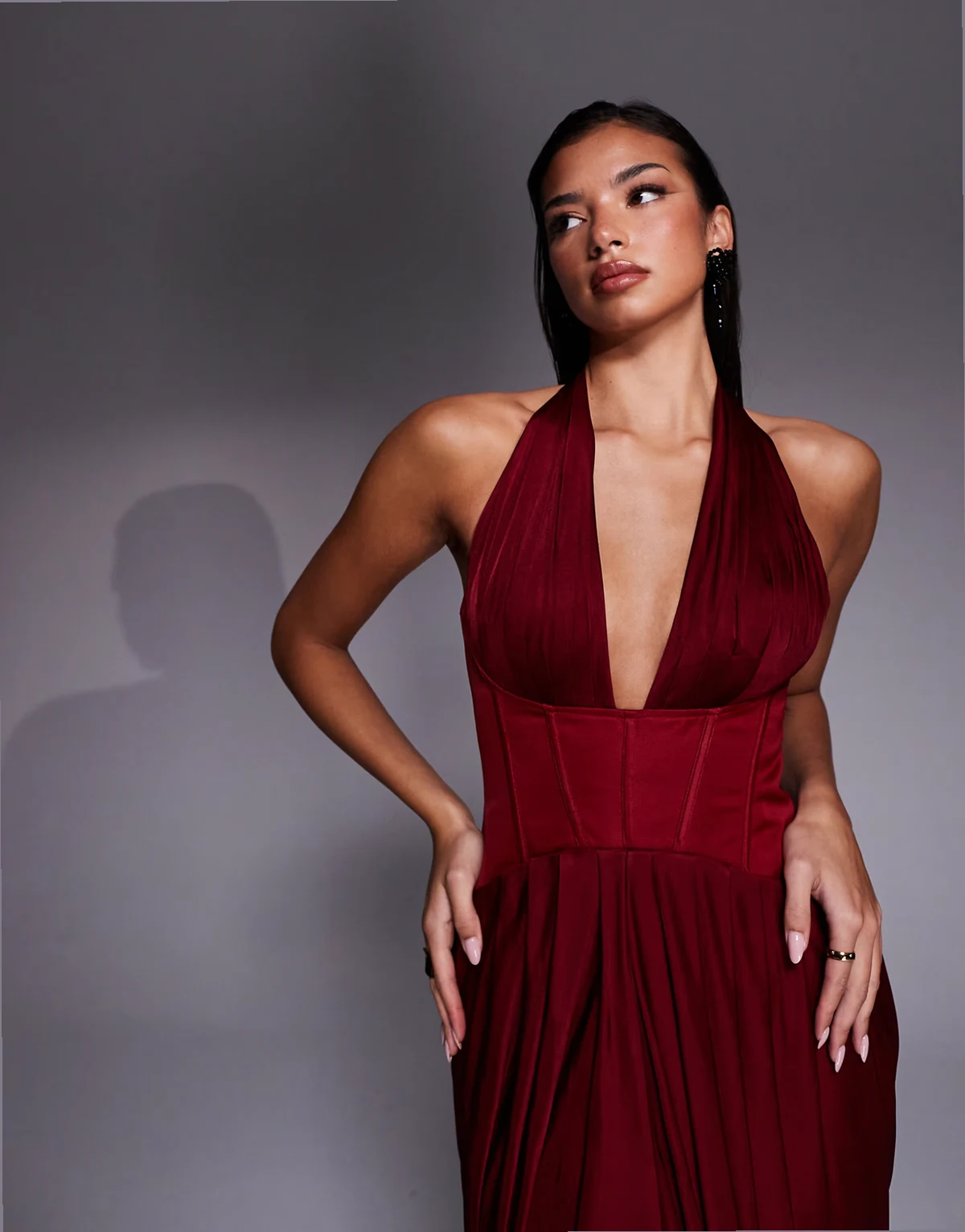 – Drape and Destiny – Bordowa sukienka maxi z głębokim dekoltem V