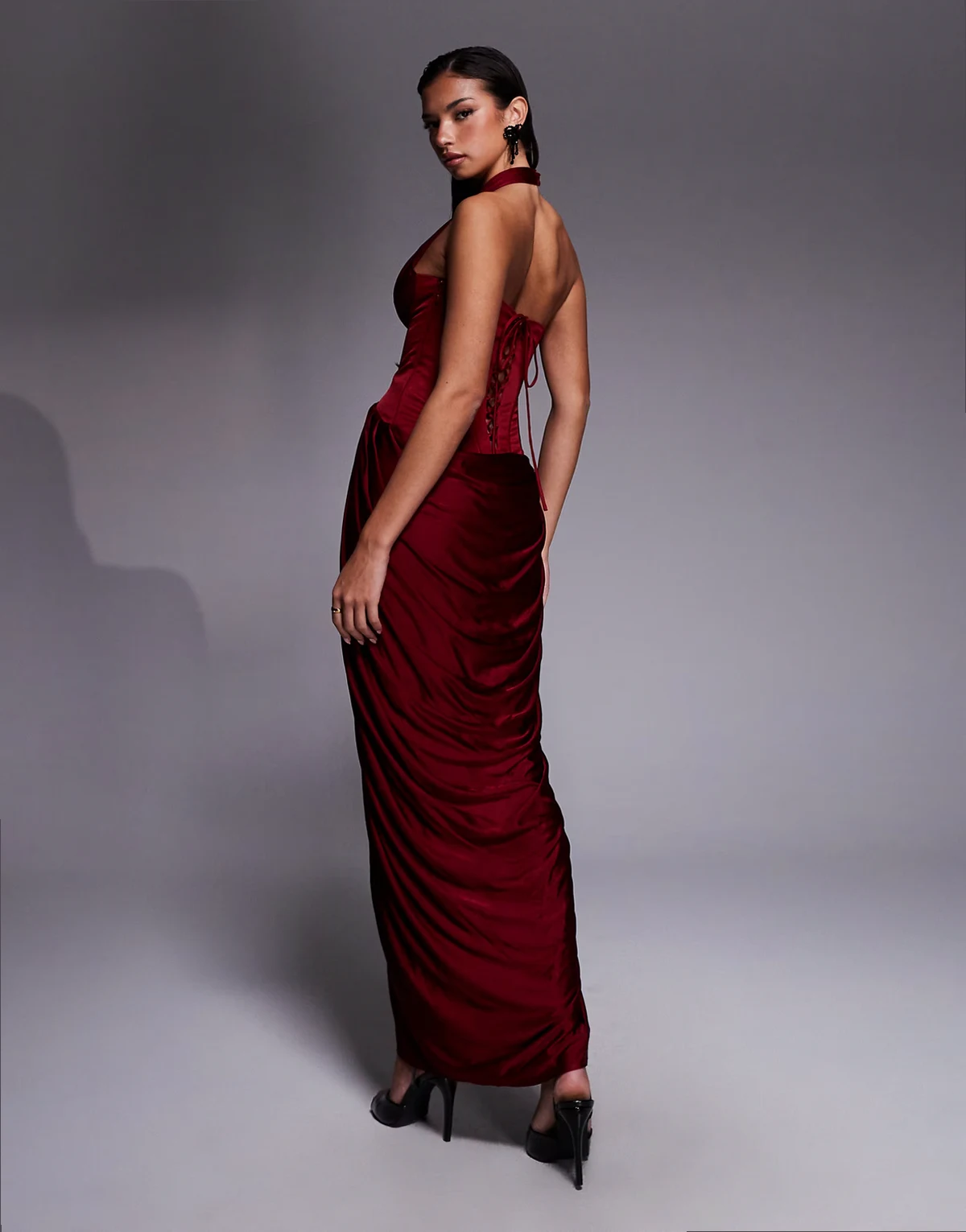 4. – Drape and Destiny – Bordowa sukienka maxi z głębokim dekoltem V