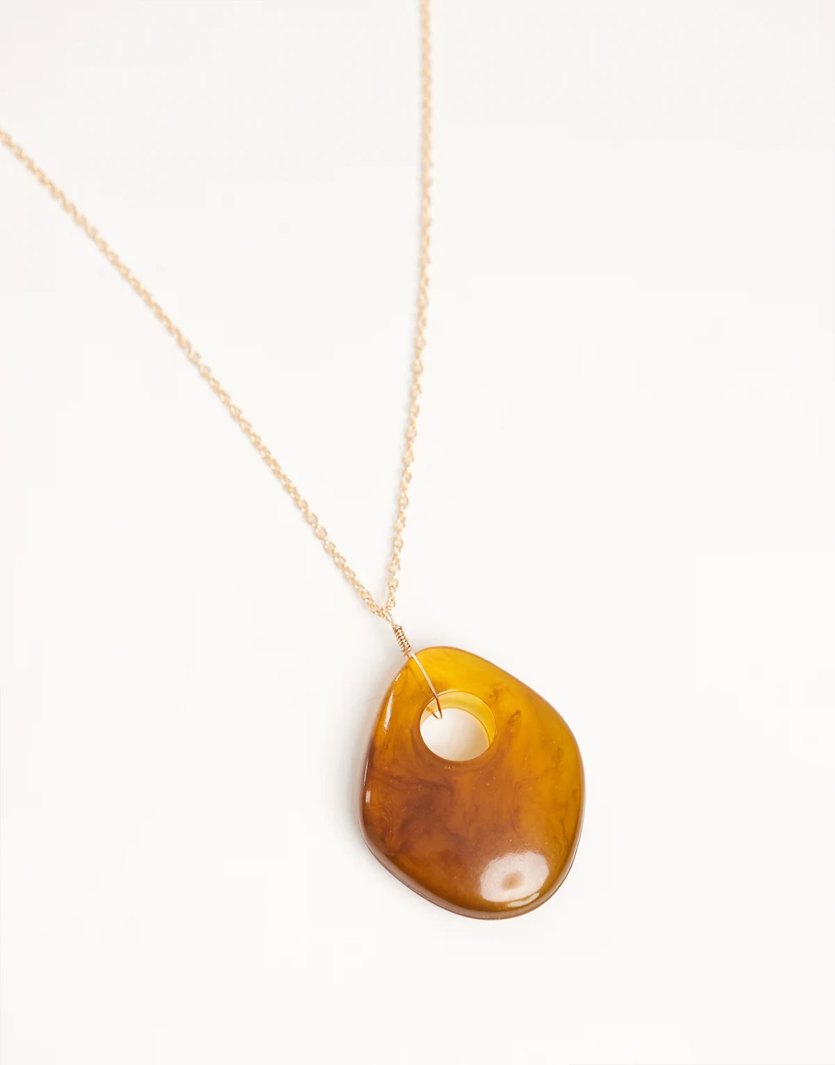 – Długi naszyjnik w kolorze złota, z zawieszką z tworzywa