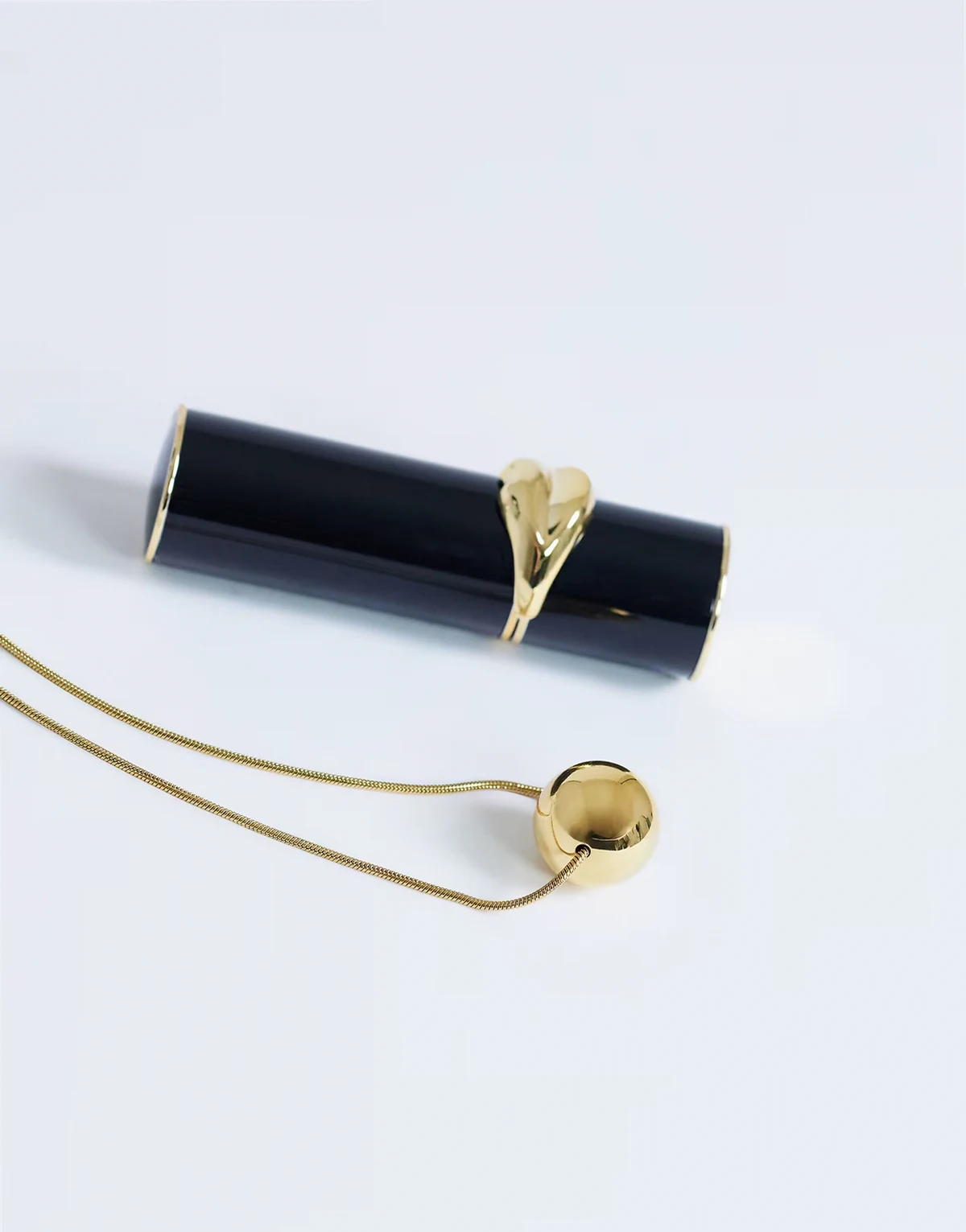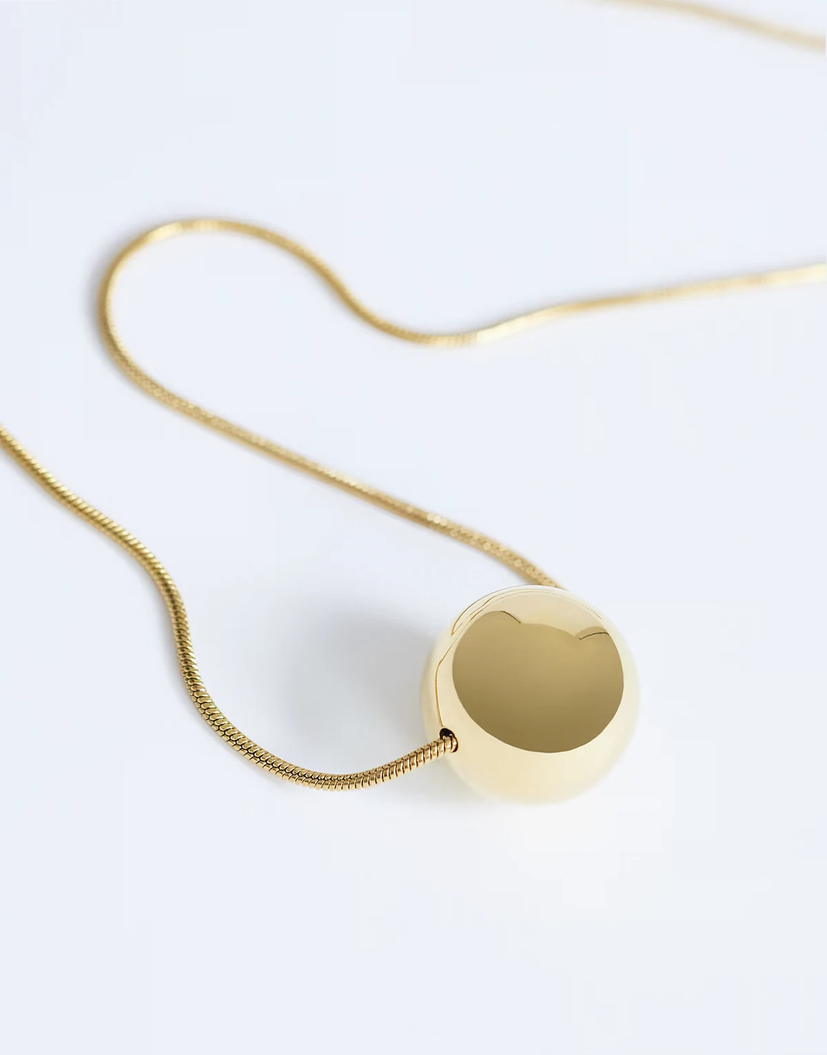 Naszyjnik Dolly został wykonany z delikatnego łańcuszka, ma zawieszkę w kształcie kulki. Jest zapinany na zapięcie lobster, ma też łańcuszek przedłużający. Ten produkt został zaprezentowany z innymi produktami. Każdy produkt jest sprzedawany oddzielnie.