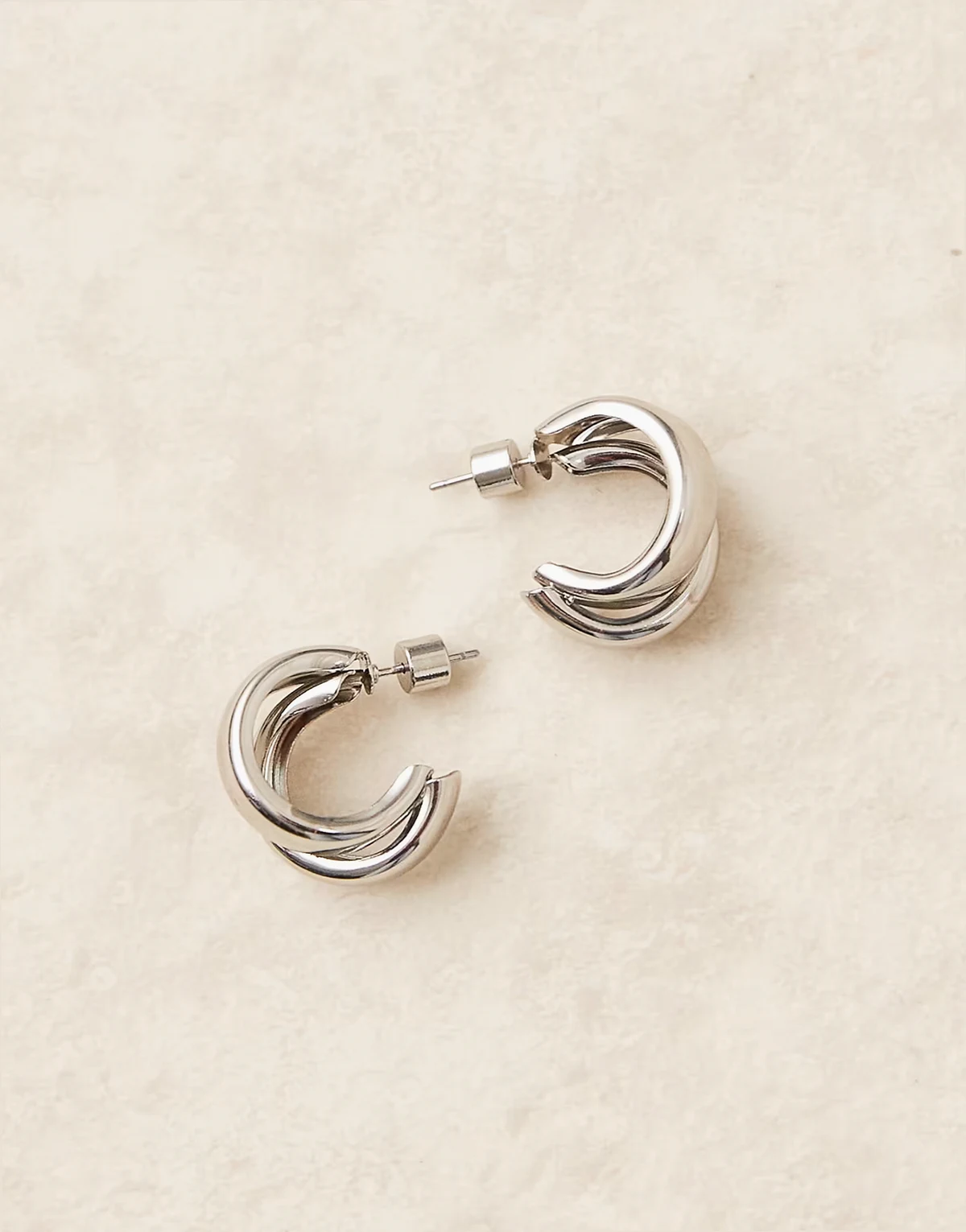 – Małe skrzyżowane kolczyki-koła w odcieniu srebra