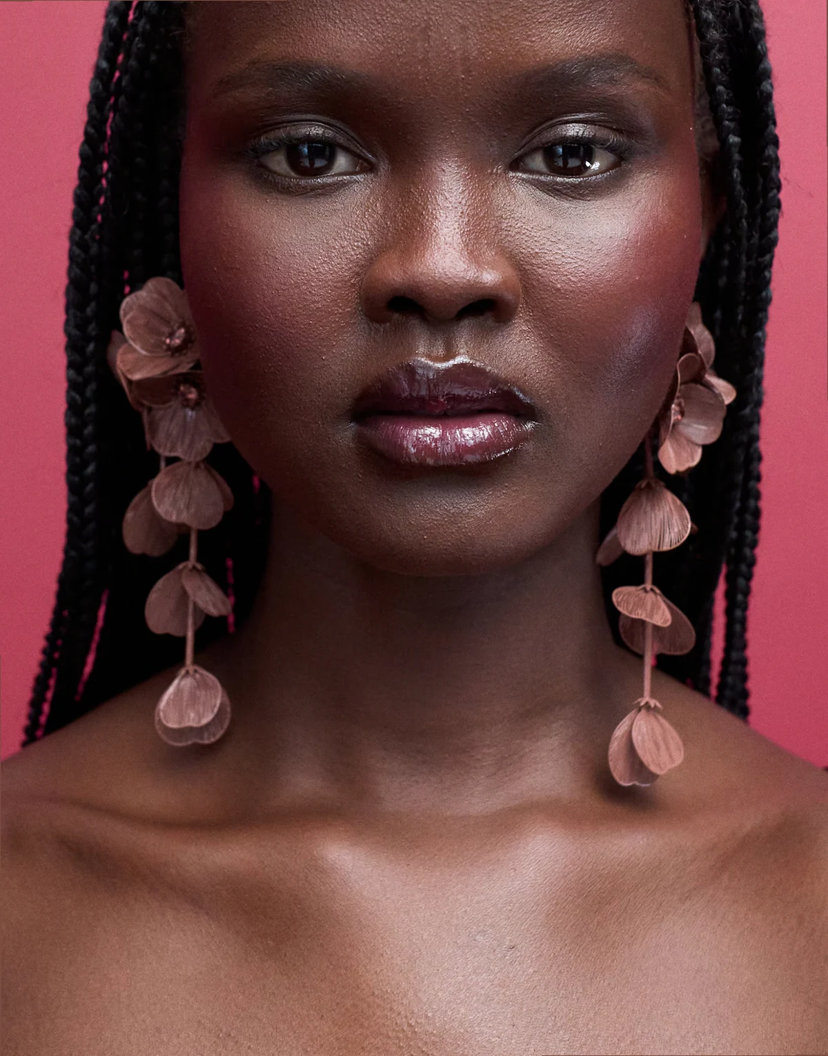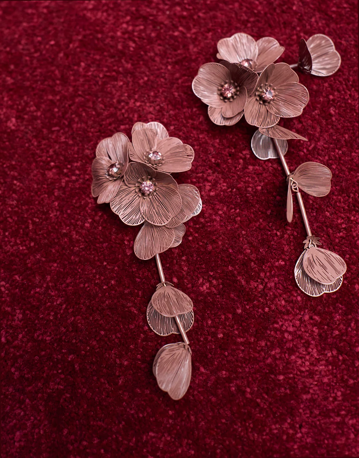 – Długie brązowe kolczyki z kwiatowym motywem 3D