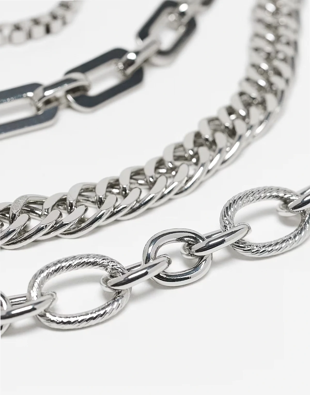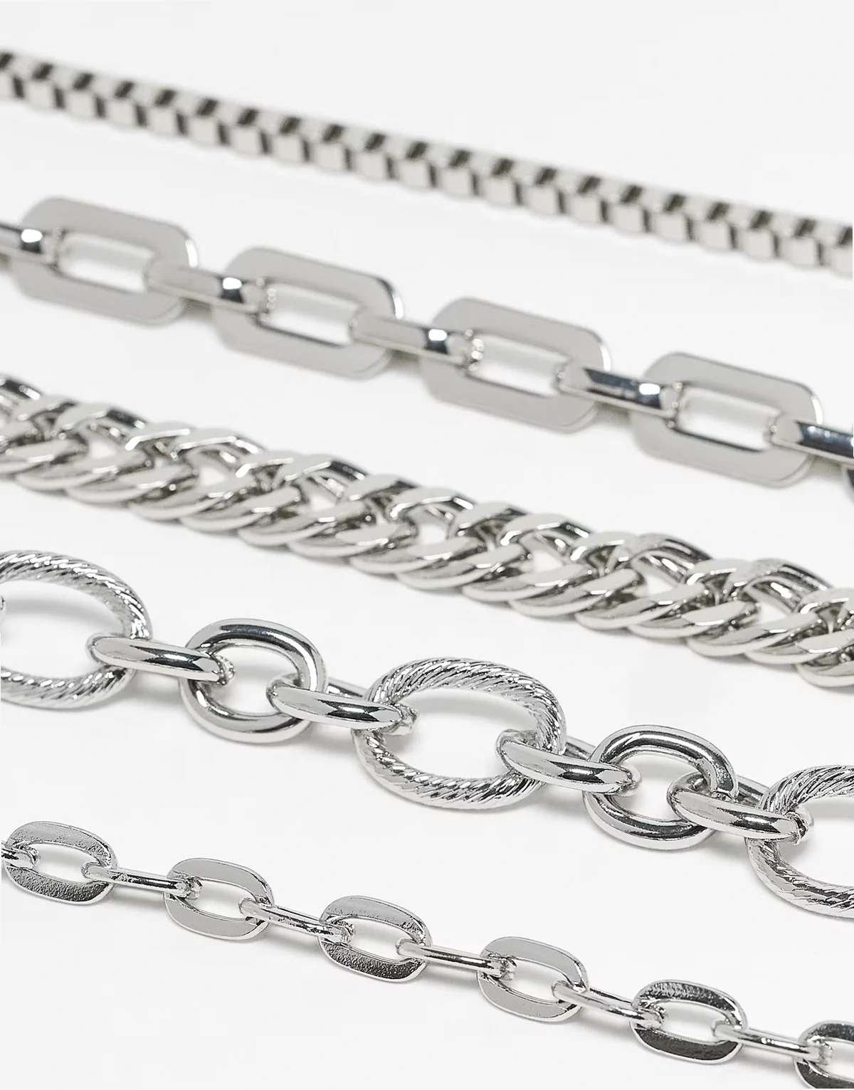 – Zestaw 5 bransoletek z różnych łańcuszków w kolorze srebra