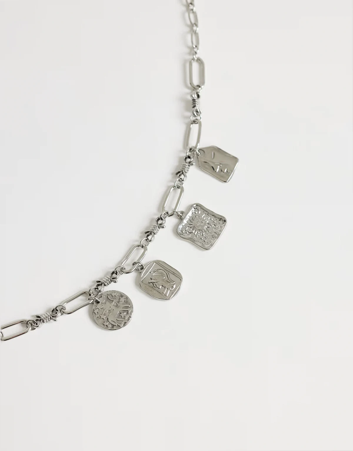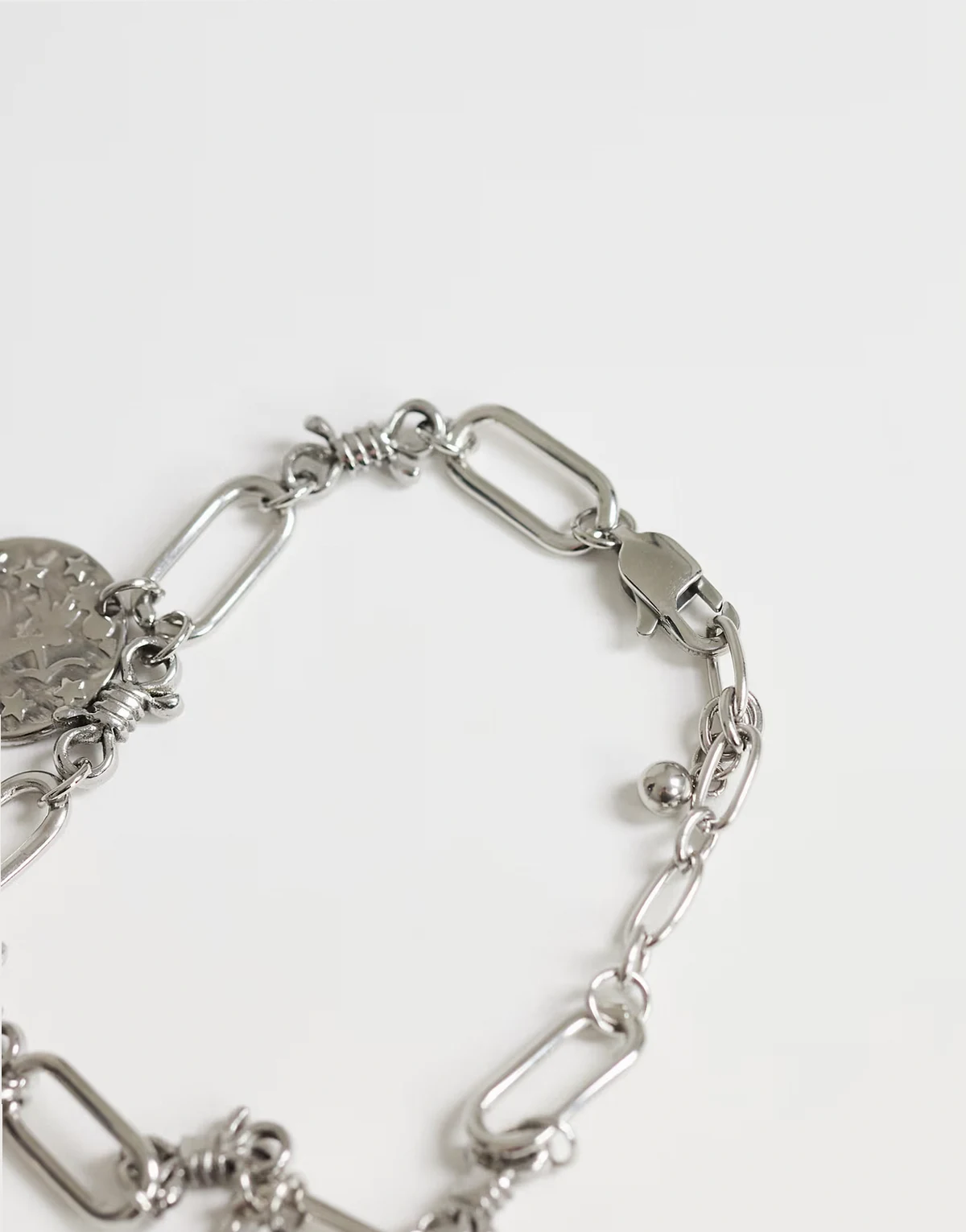 Ta bransoletka została wykonana ze stali nierdzewnej w odcieniu srebra. Ten model składa się z różnych ogniw i ma cztery młotkowane zawieszki oraz zapięcie lobster.