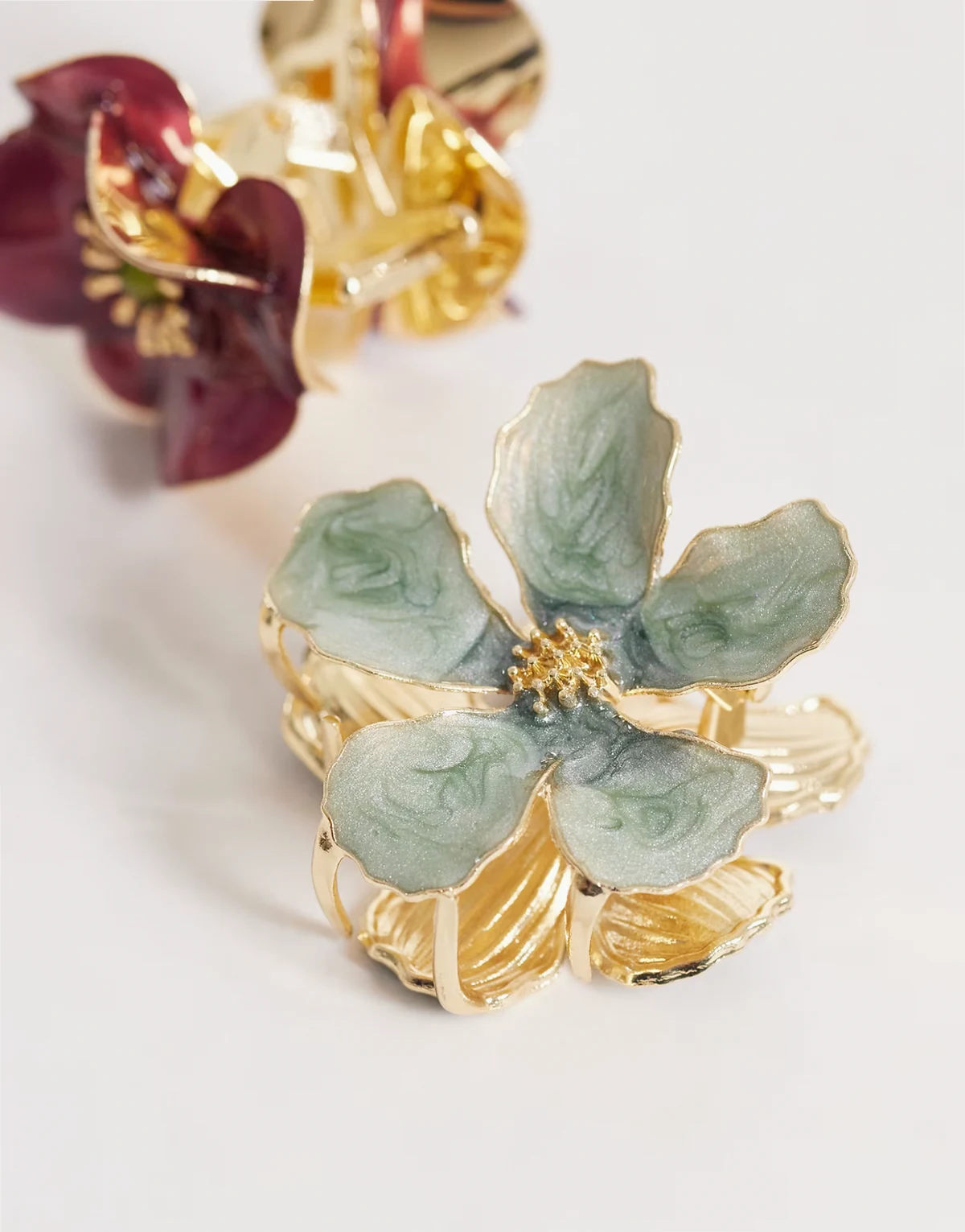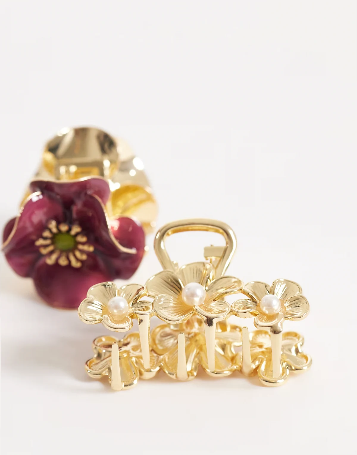 – Zestaw 3 metalowych klamerek do włosów w kolorze złotym z emaliowanymi kwiatkami