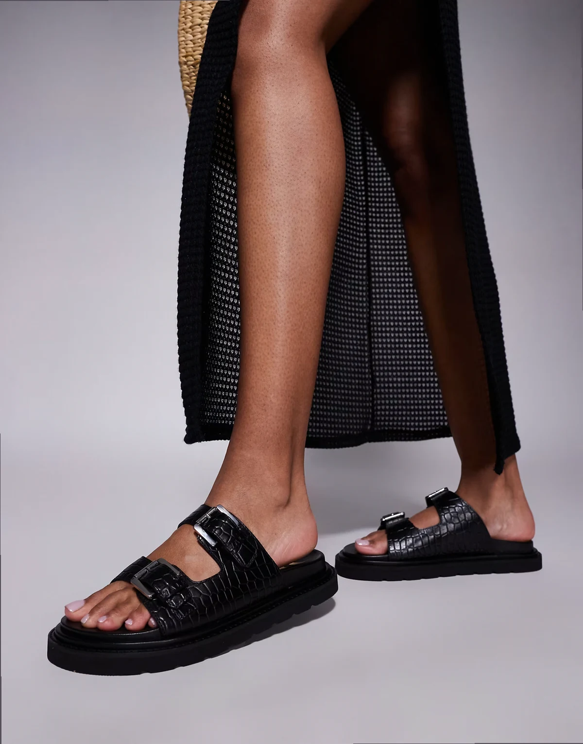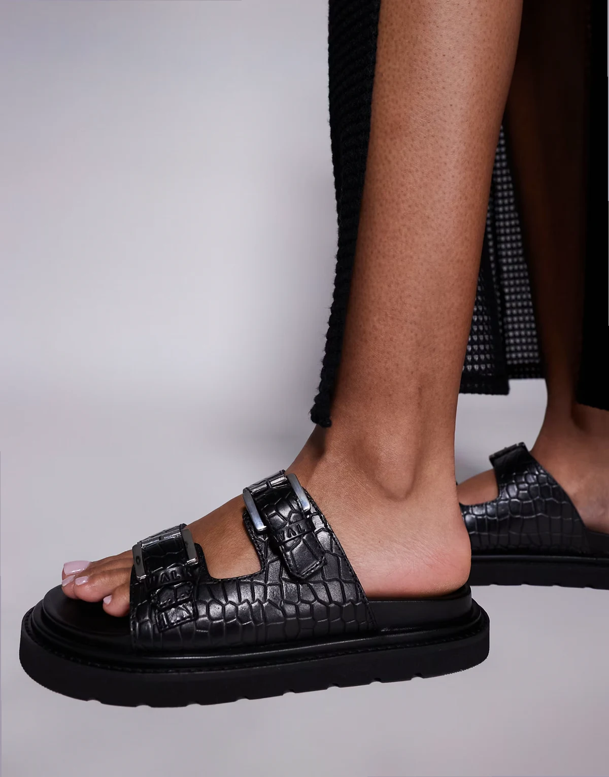 – Budapest – Czarne skórzane sandały z dwoma paskami z wytłoczonym wzorem
