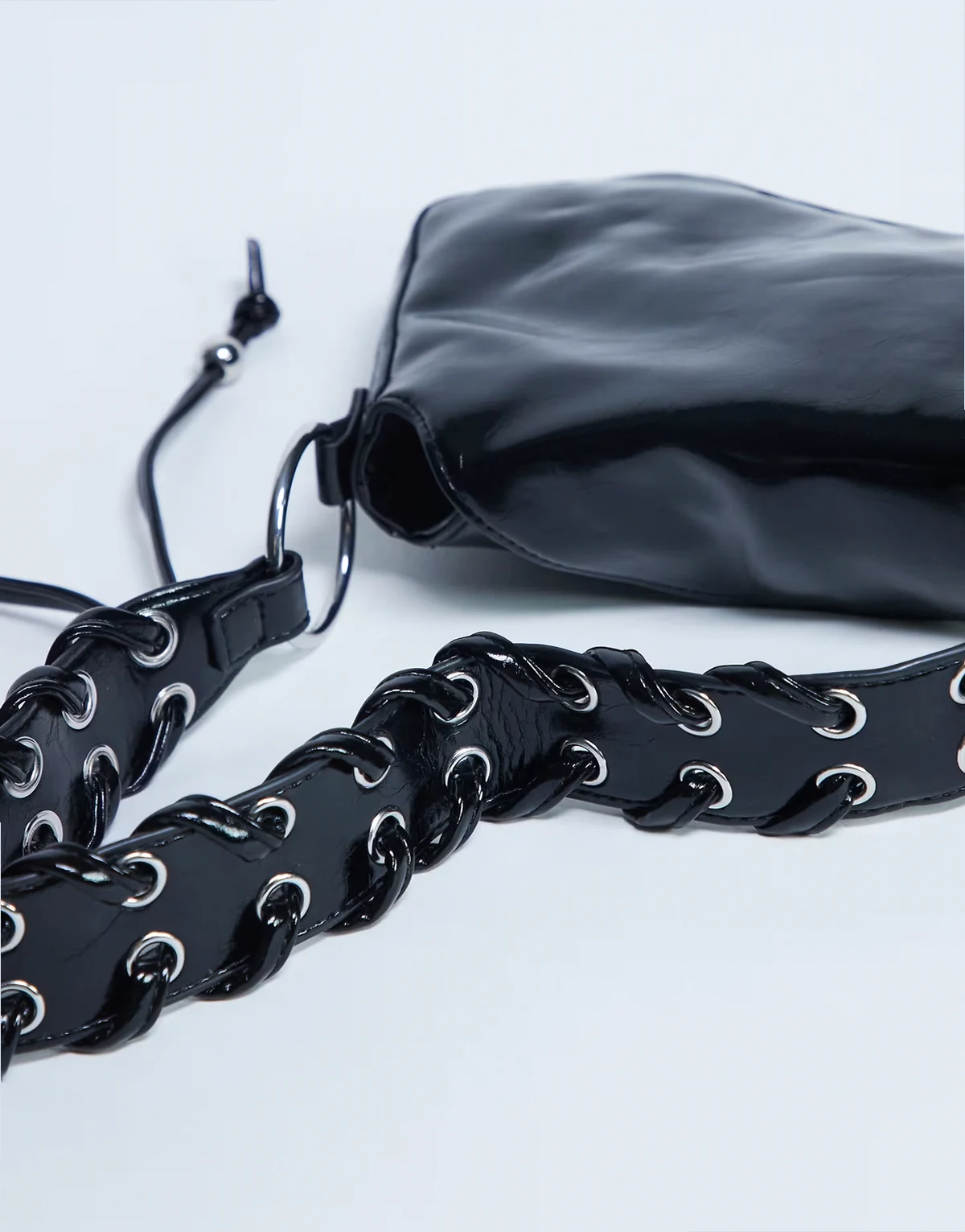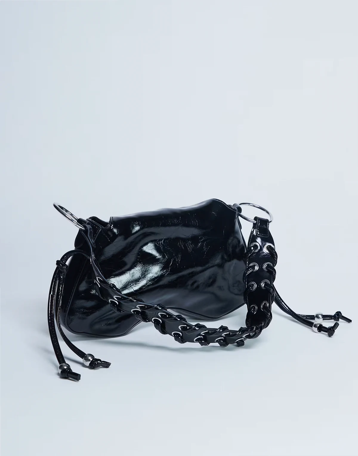 Torebka na ramię Sarah została wykonana z błyszczącej, lakierowanej tkaniny. Ma pasek z ozdobnymi przeszyciami, wywijana klapkę i metalowe wstawki w odcieniu srebra.
