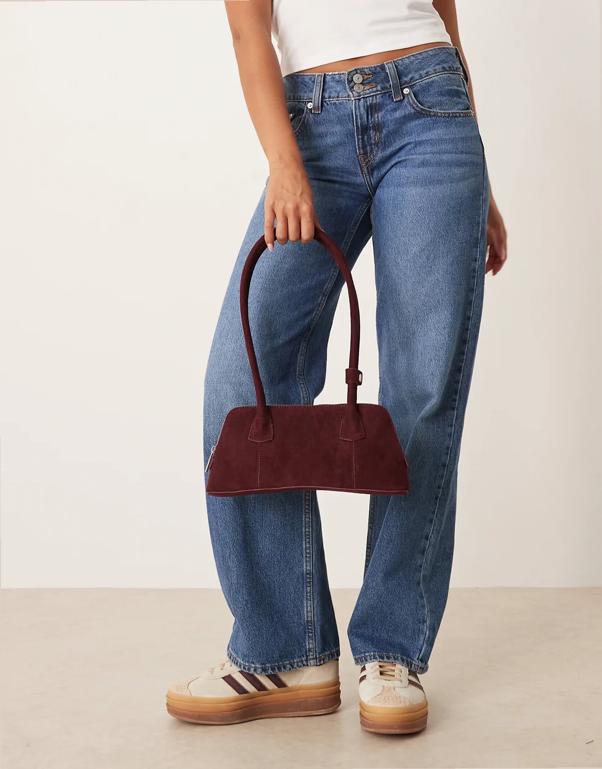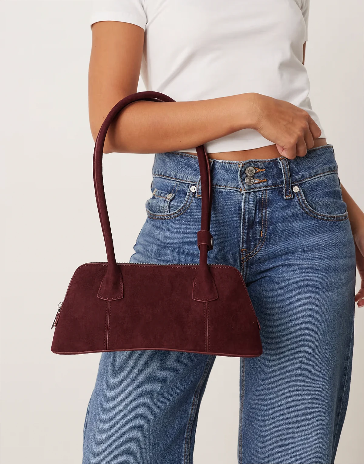 – Bordowa torba typu bowler z imitacji zamszu z zakrzywioną podstawą