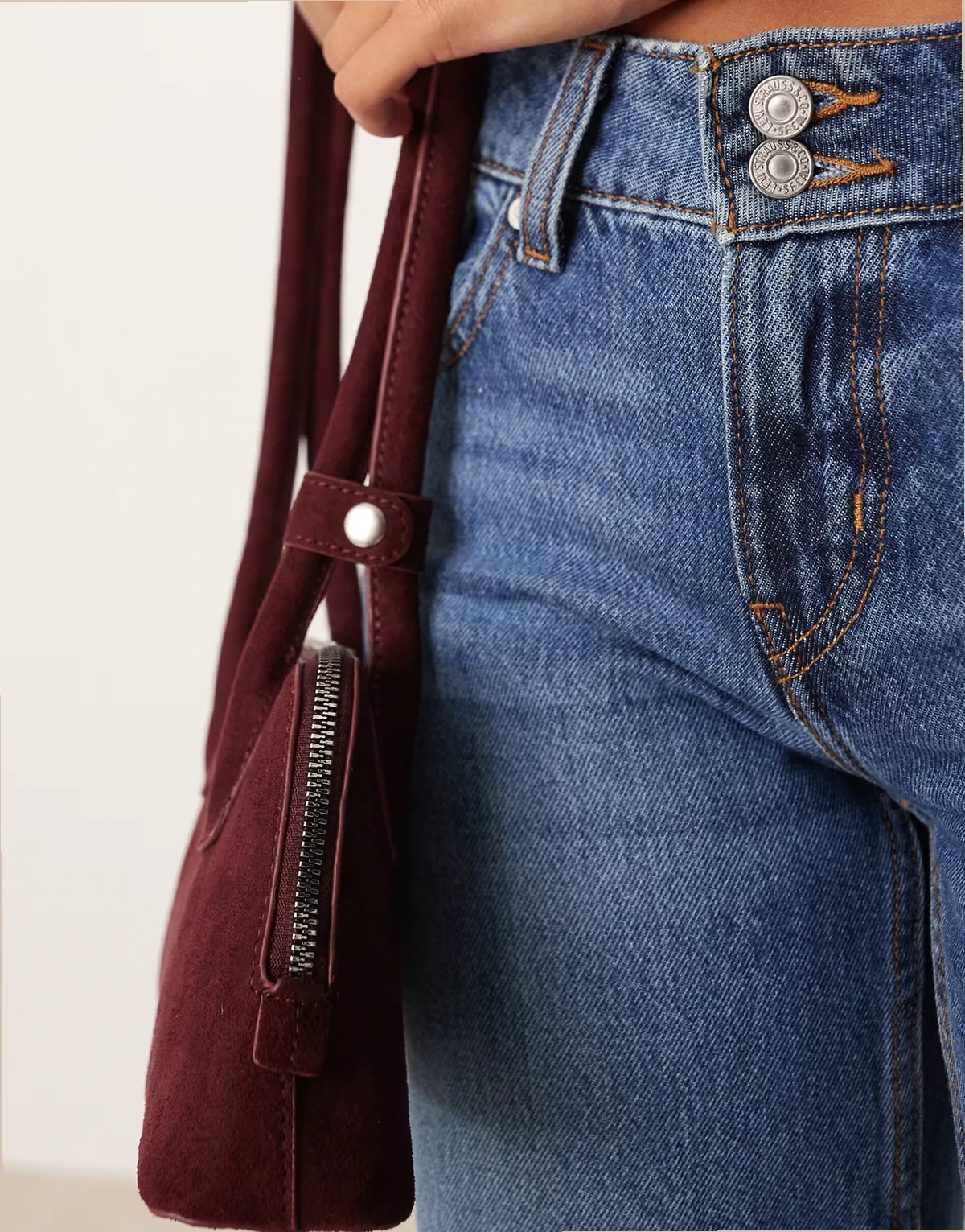 – Jasnobrązowa torebka na ramię z dwoma paskami z imitacji zamszu