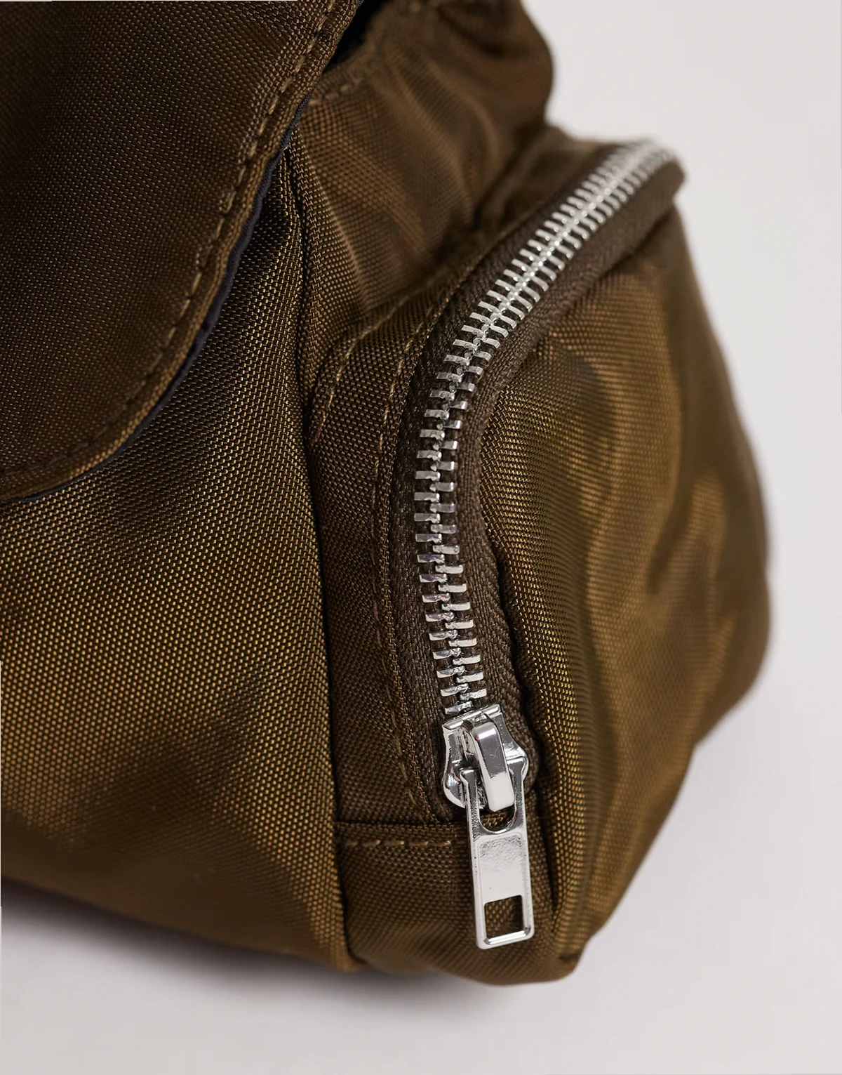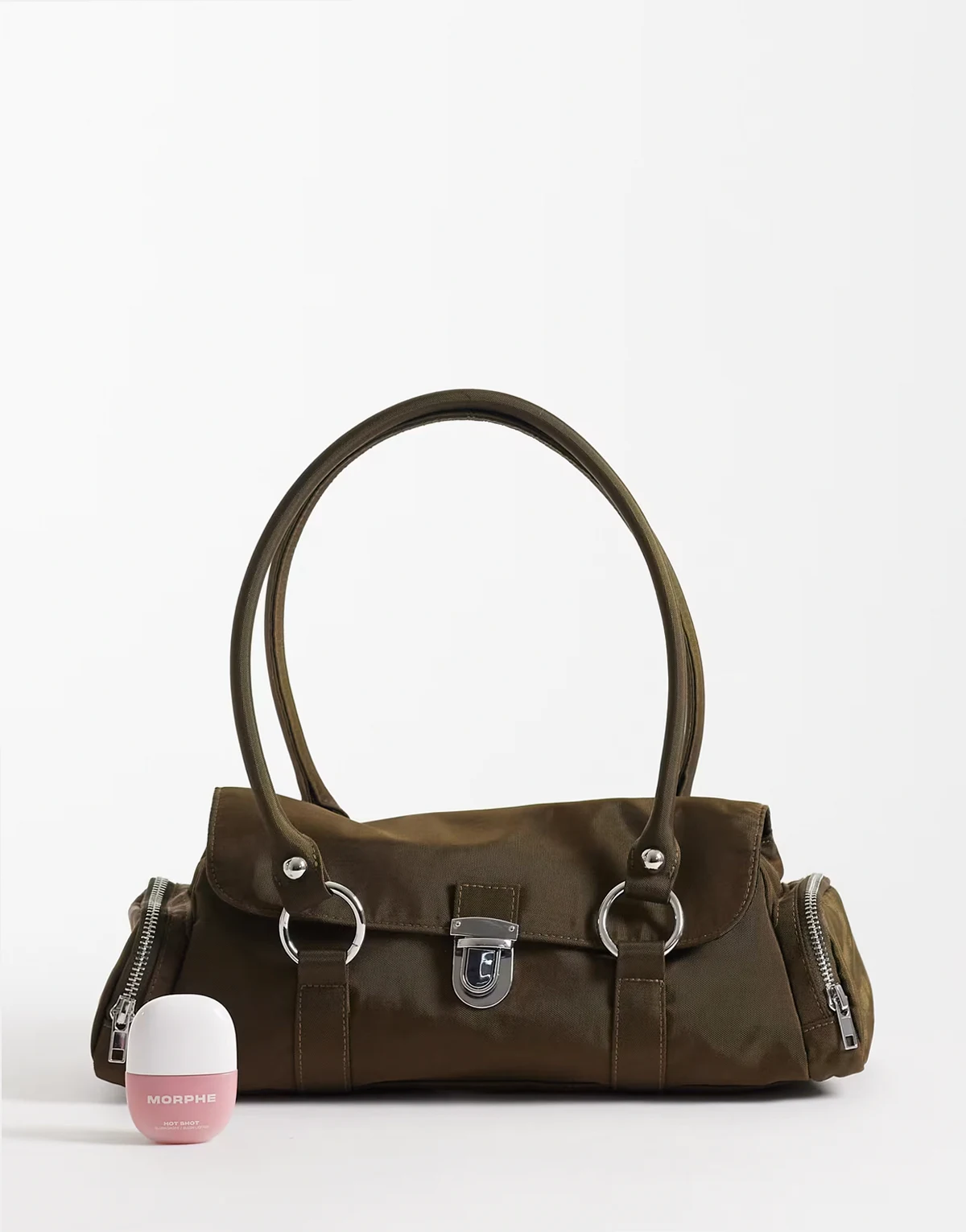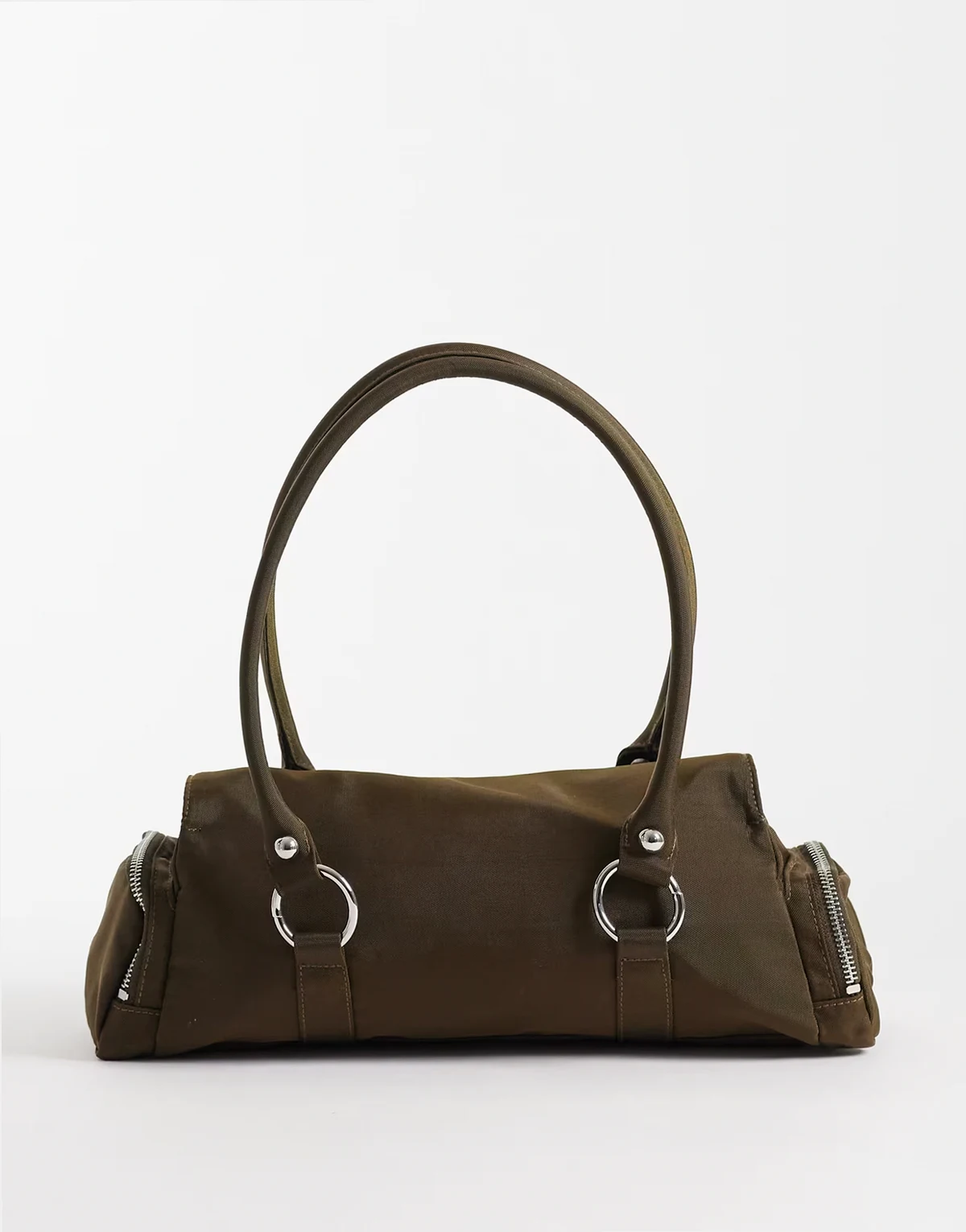 – Mała torebka na ramię, w kolorze khaki, ze srebrnymi elementami