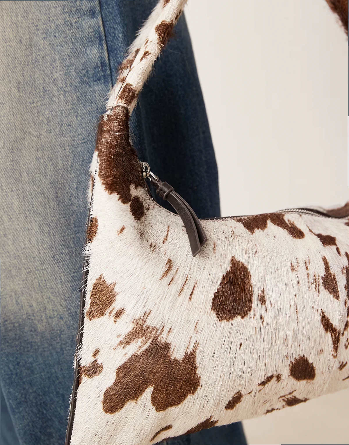 – Trapezowa torebka na ramię z naturalnej skóry z włosiem ze wzorem w krowie łaty