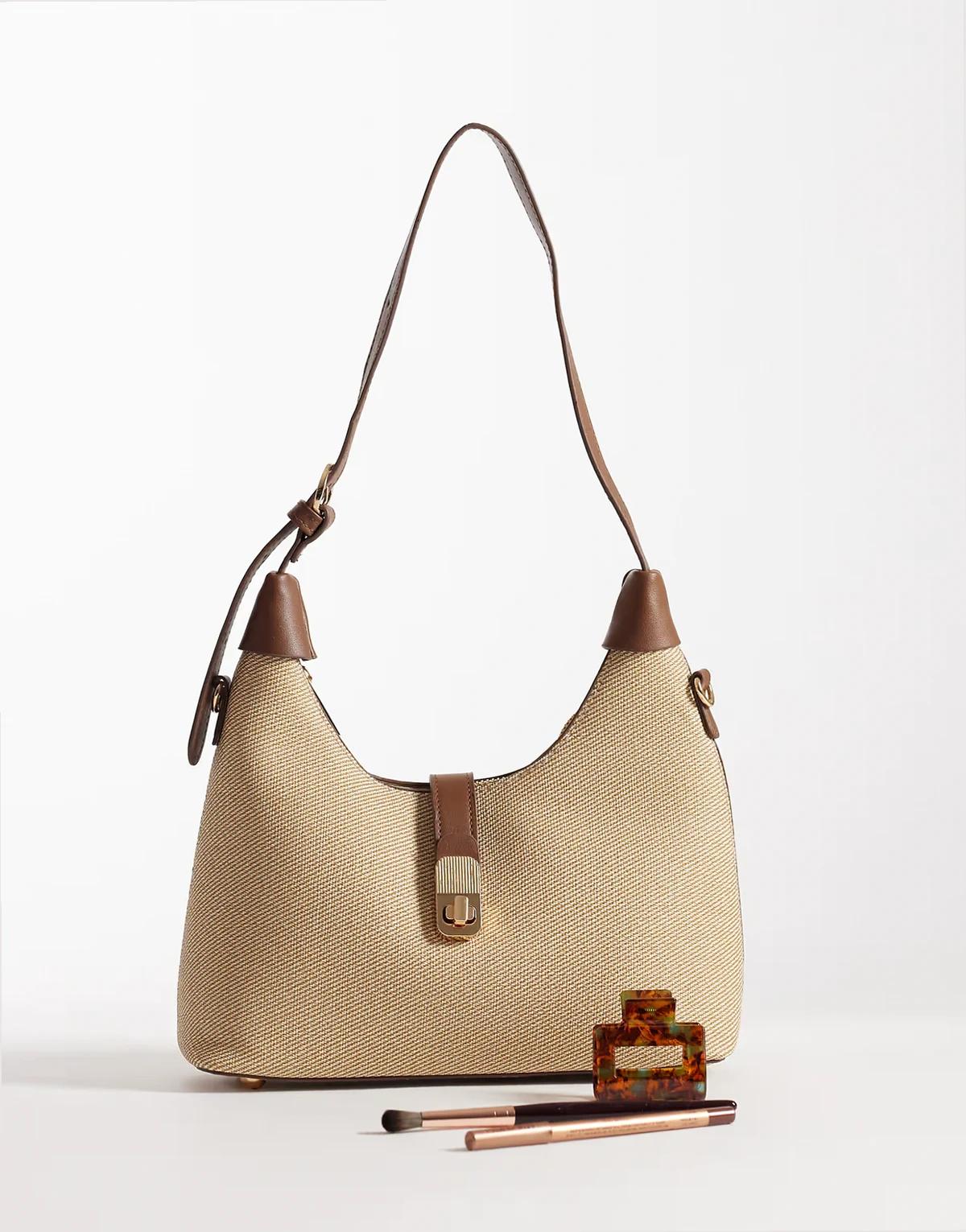 – Kremowa pleciona torebka na ramię z rafii z elementami z imitacji skóry