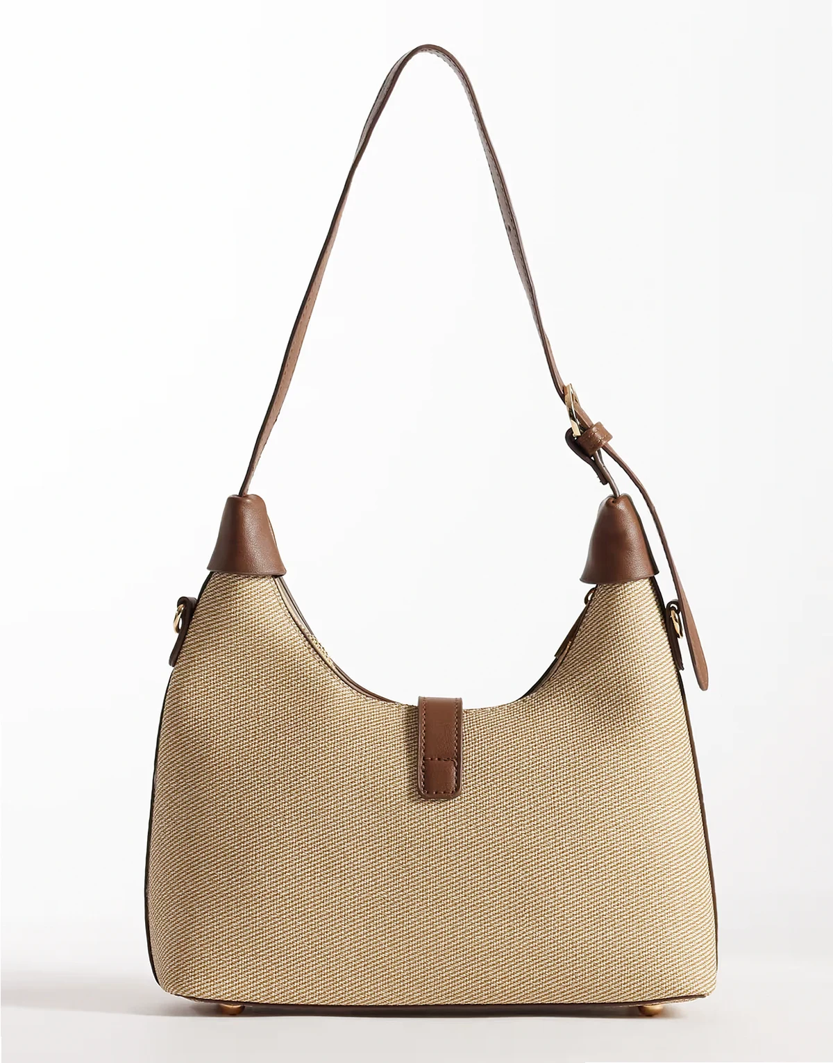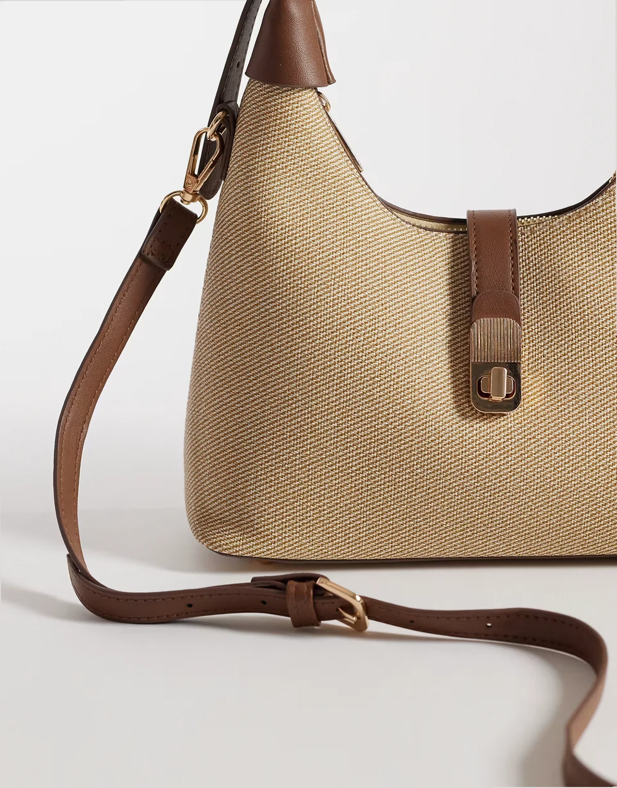 – Jasnobrązowa torebka na ramię z dwoma paskami z imitacji zamszu