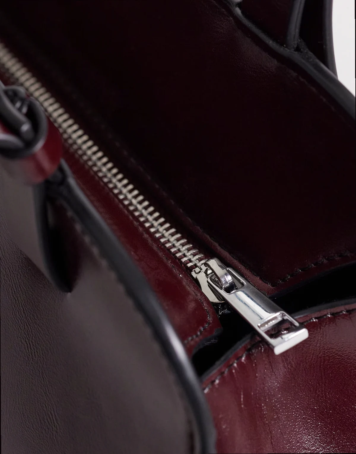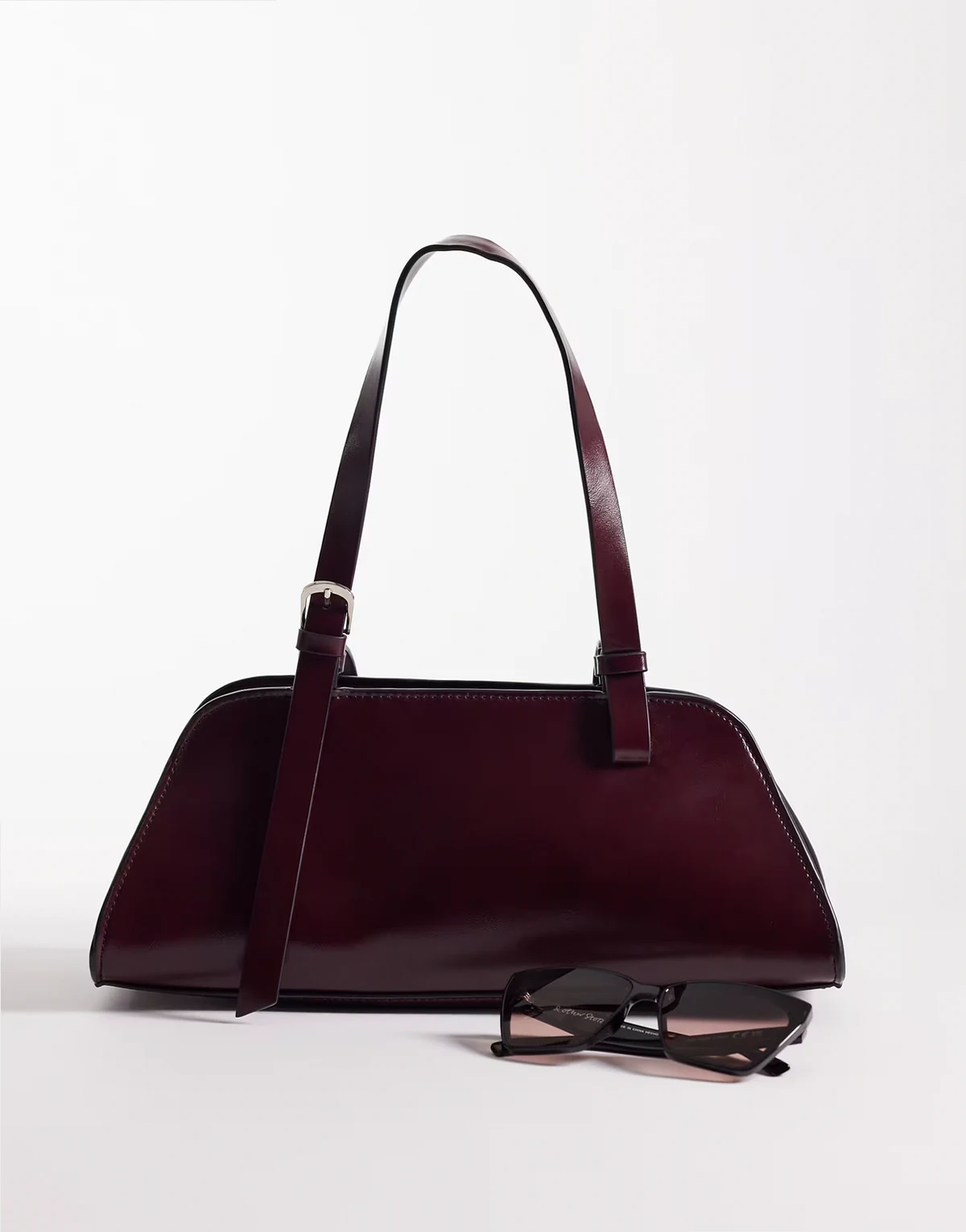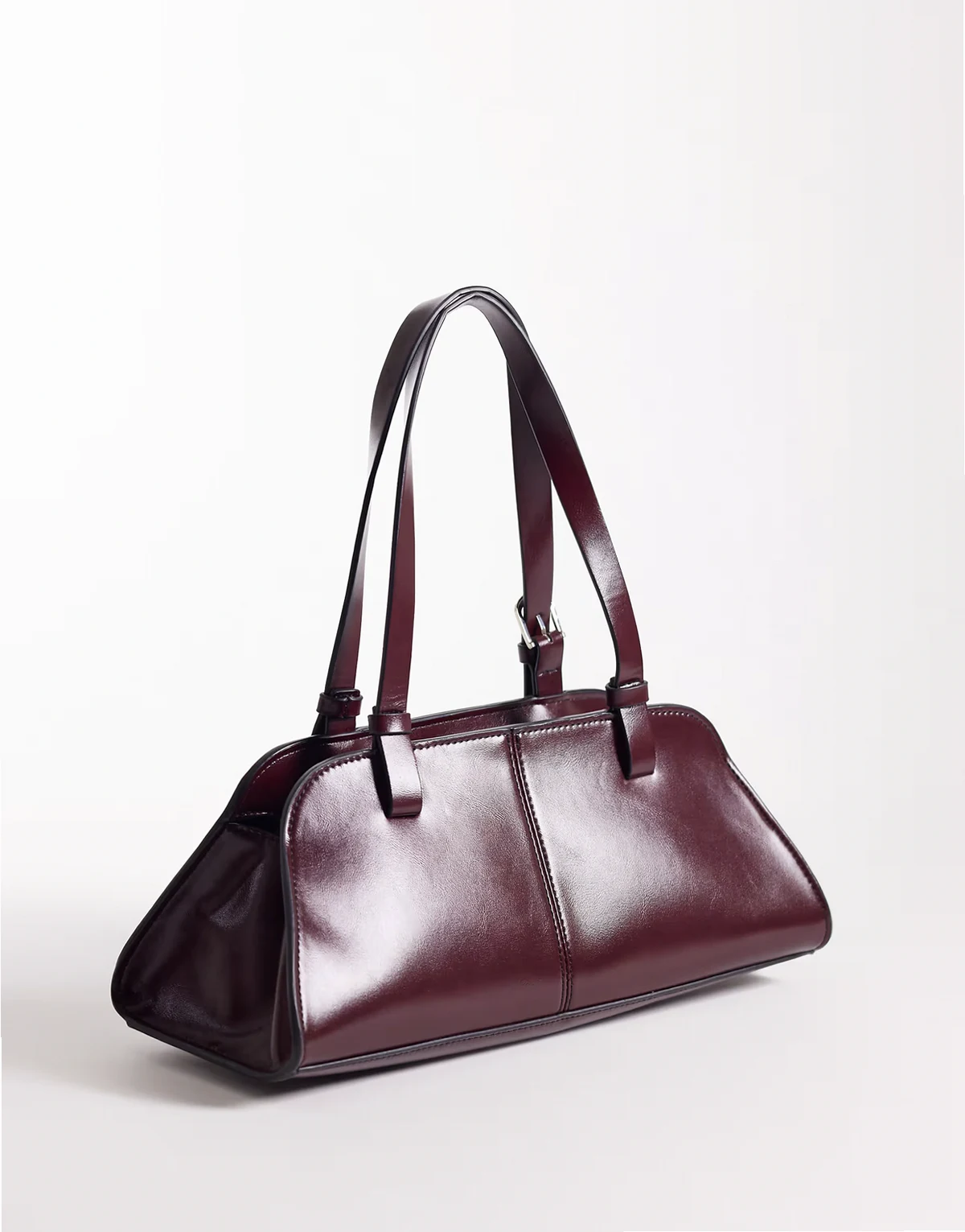 – Bordowa kanciasta torebka bowler z paskiem z klamrą