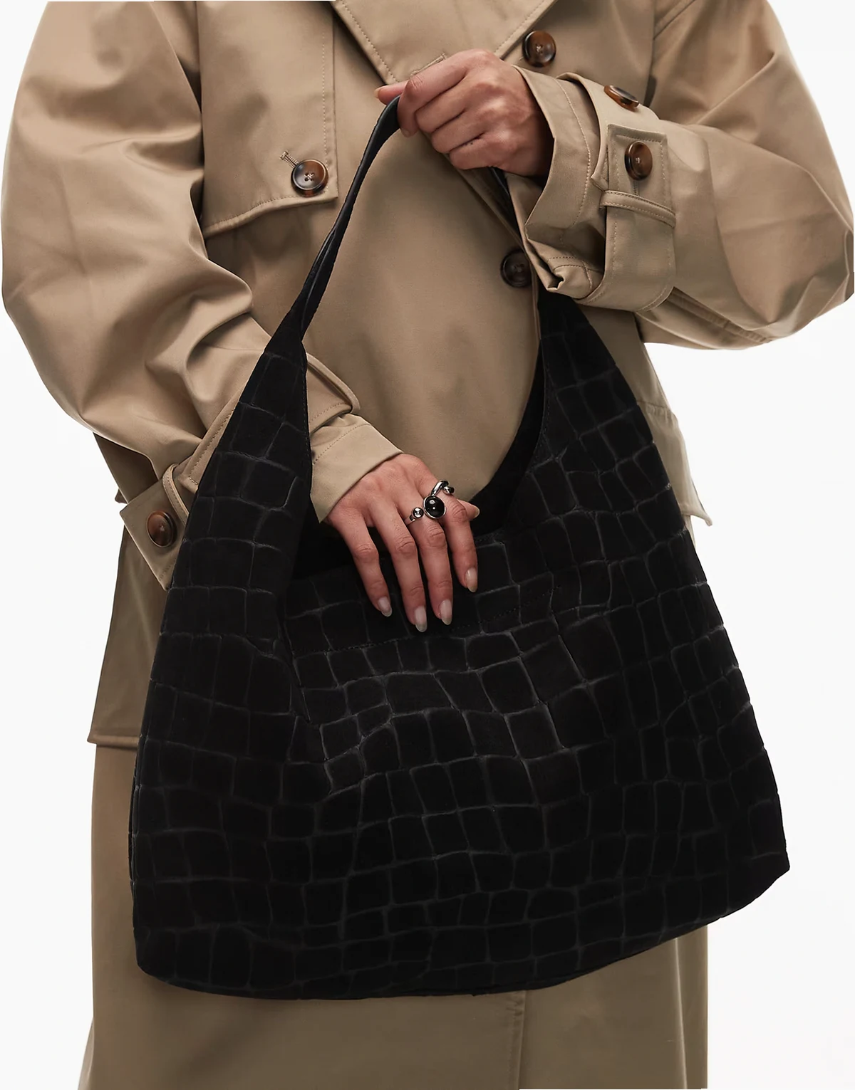 4. – Duża czarna zamszowa torba typu tote z motywem skóry krokodyla