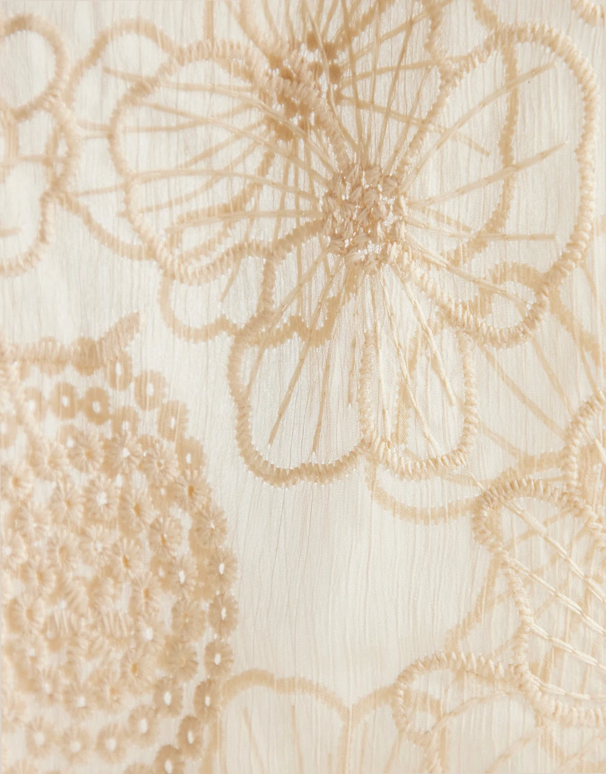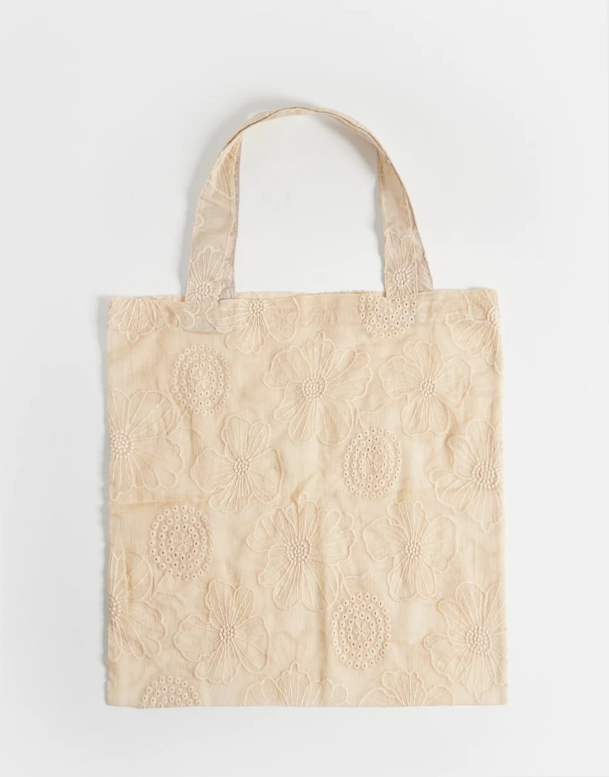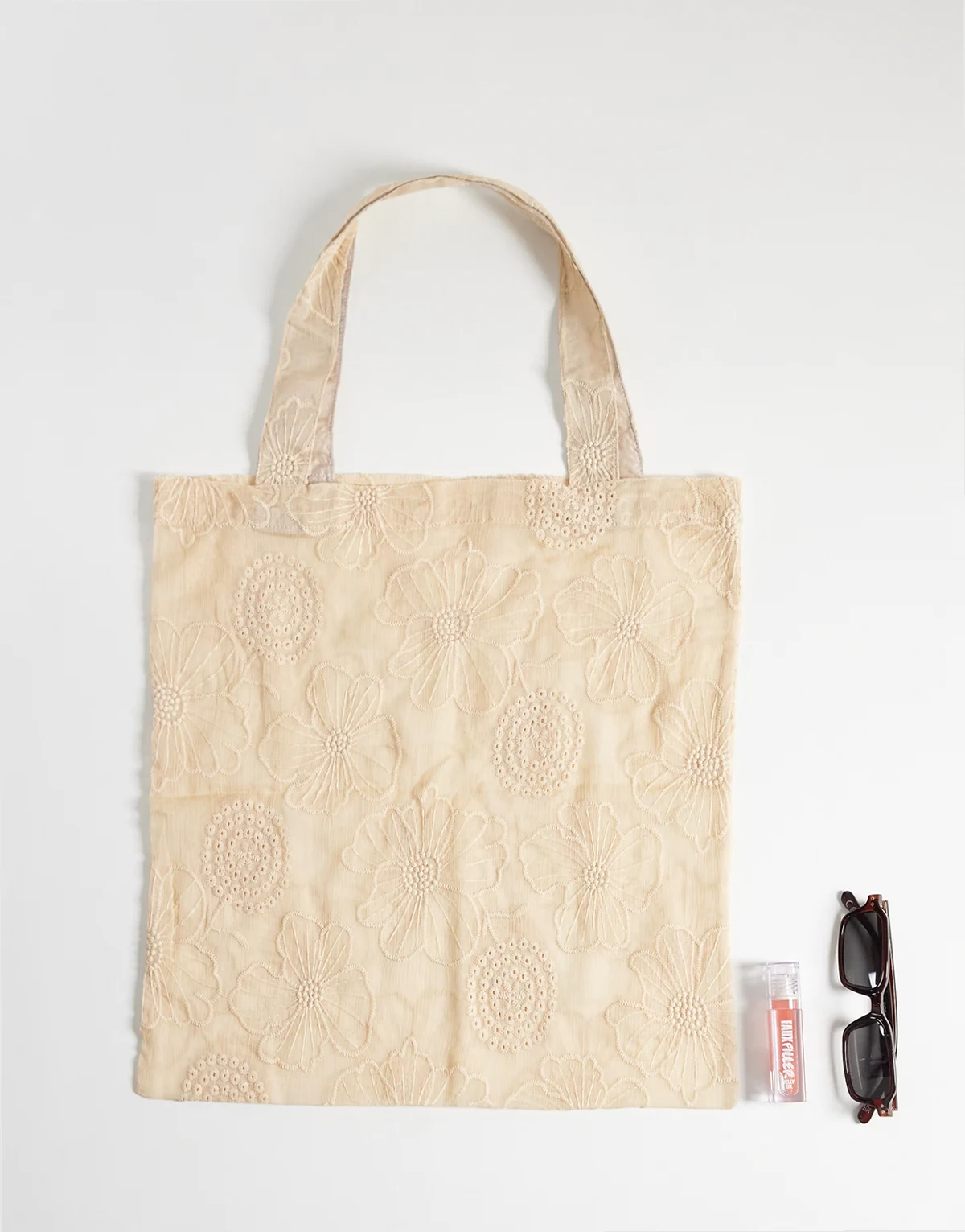 – Kamiennobeżowa prześwitująca torba typu tote w haftowany kwiatowy wzór