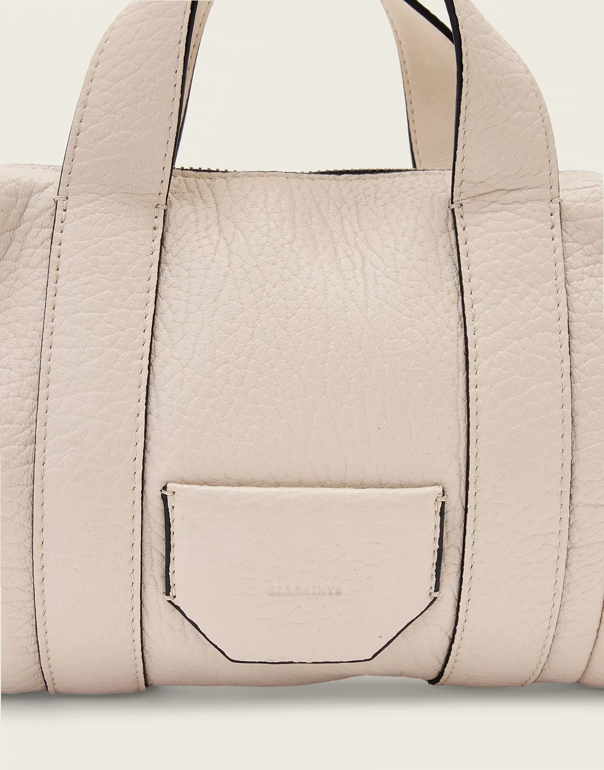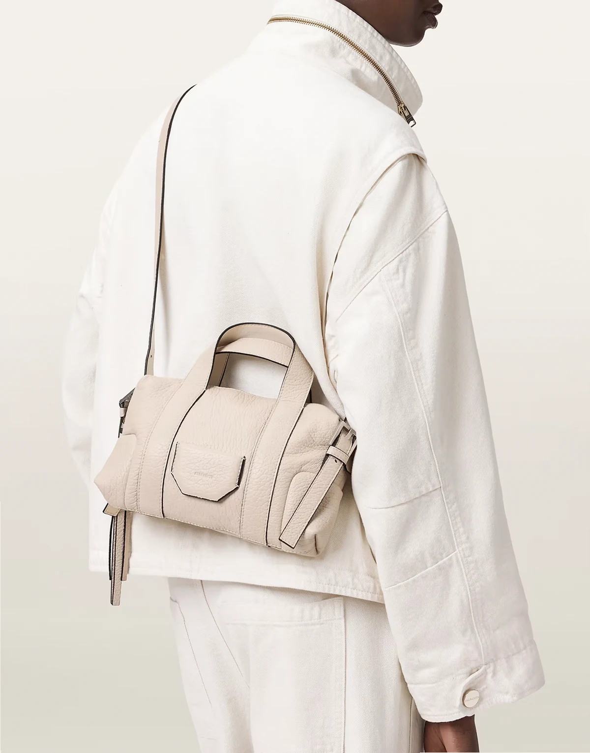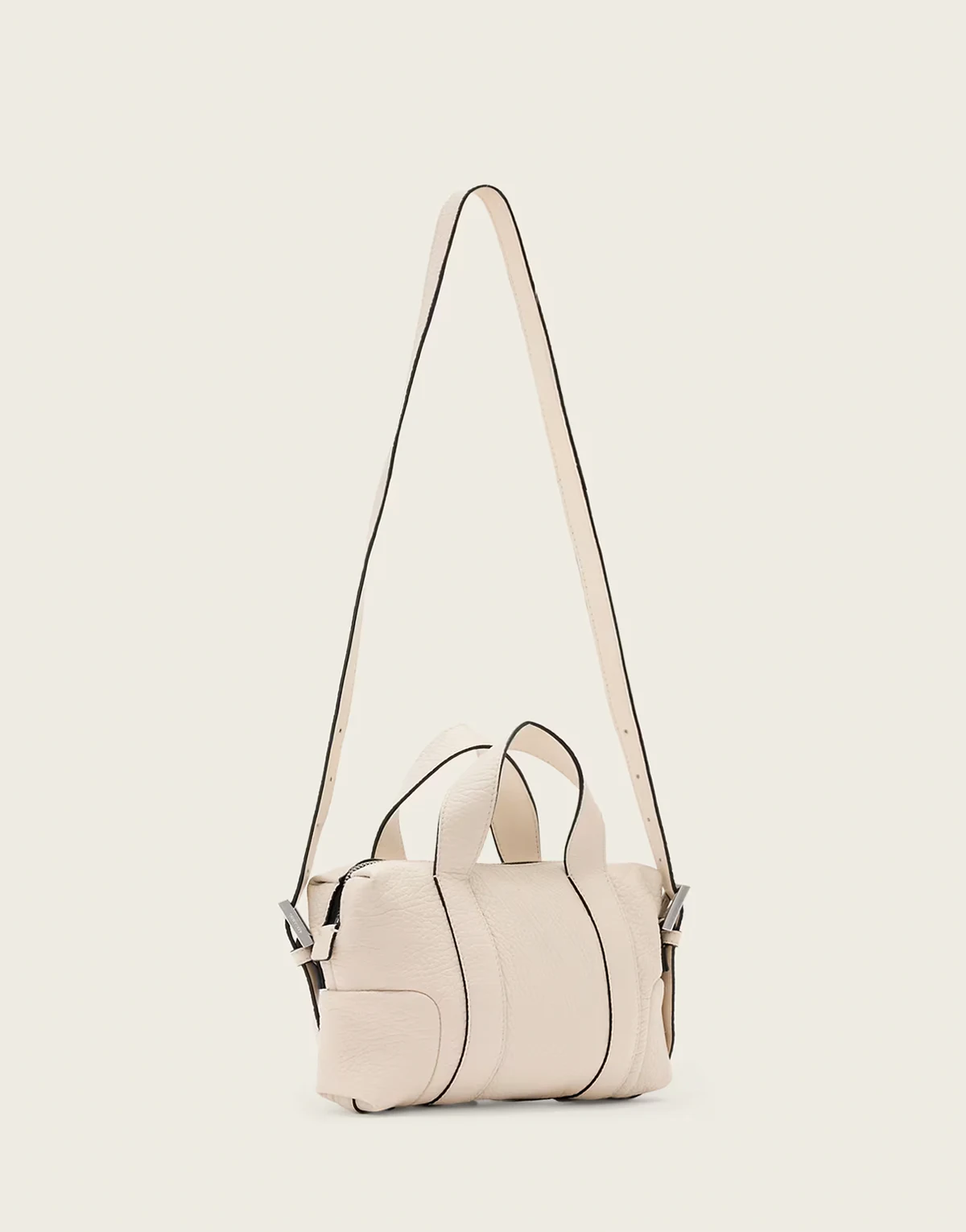 – Zaokrąglona torebka do ręki w kolorze złamanej bieli z paskiem crossbody
