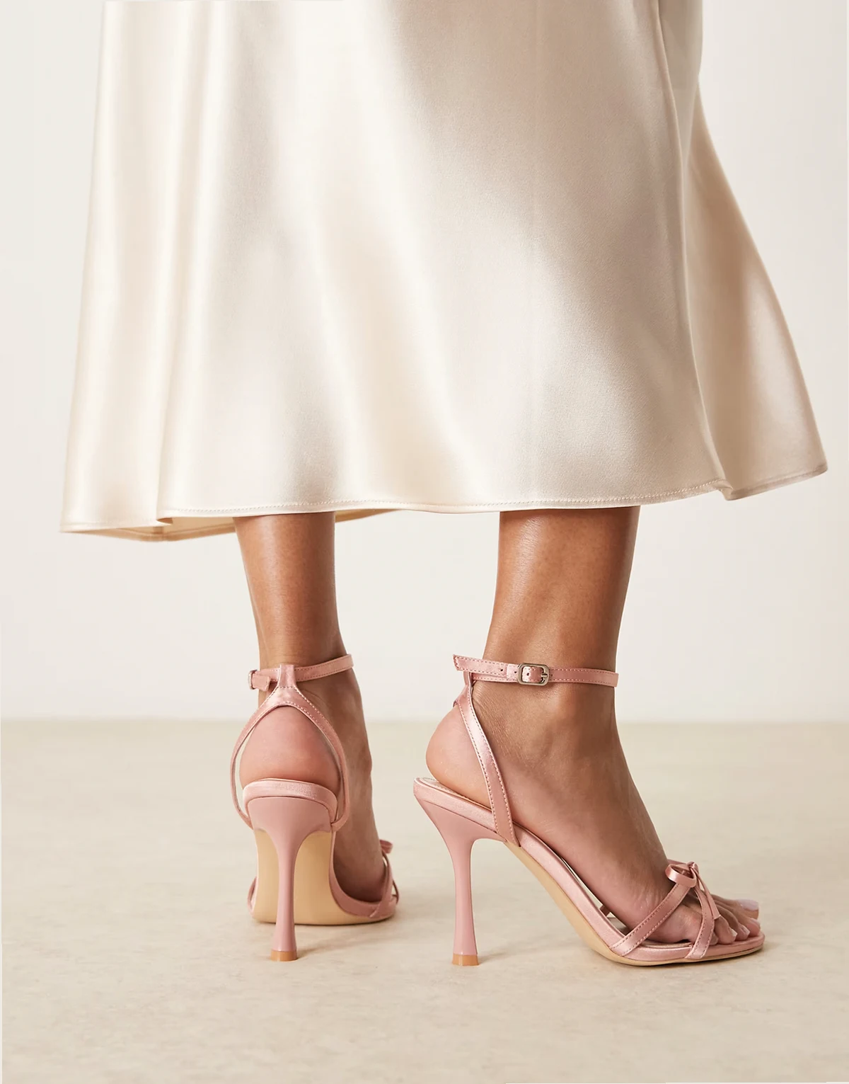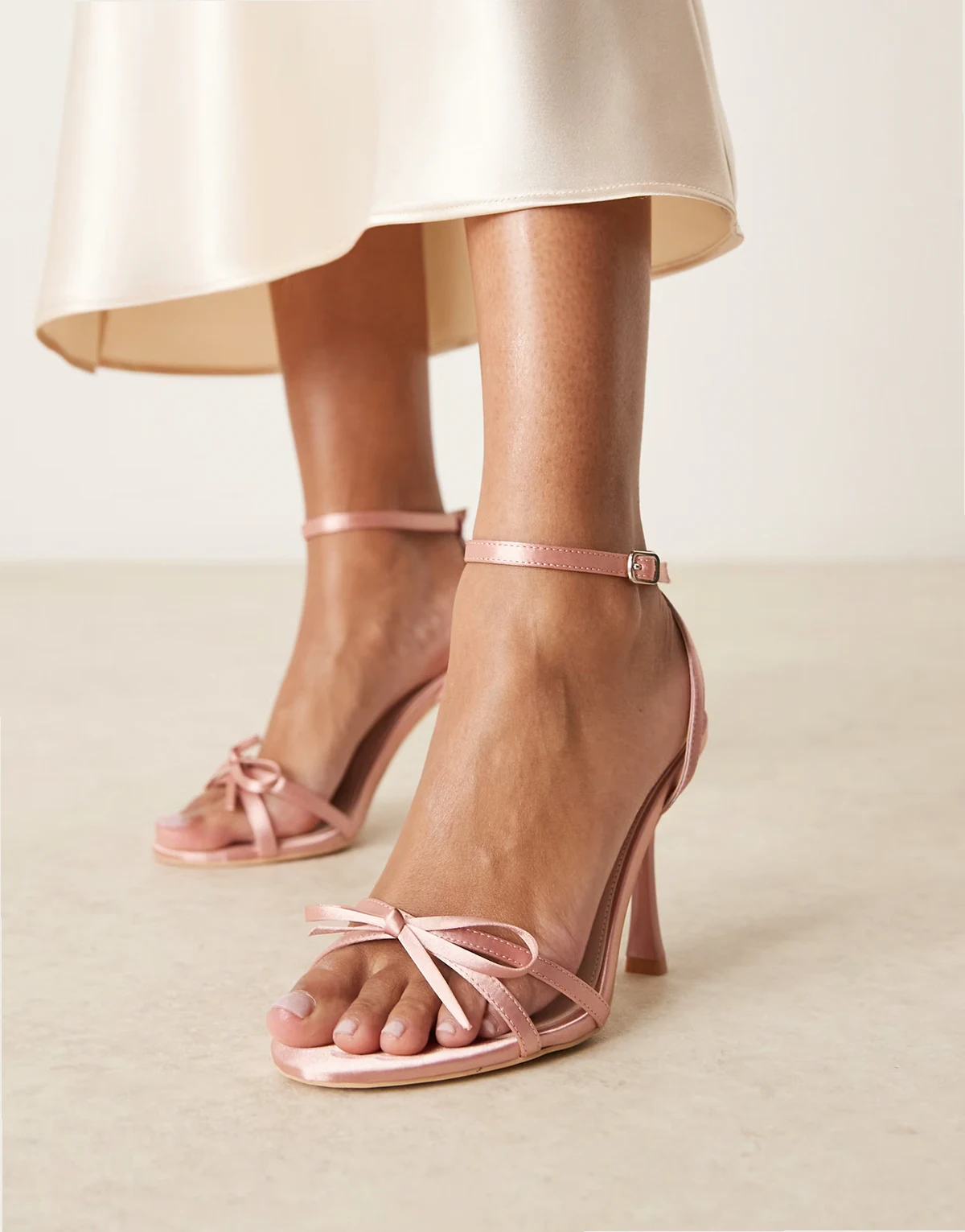 – Sharly – Pudroworóżowe, satynowe sandały na obcasie, z kokardką