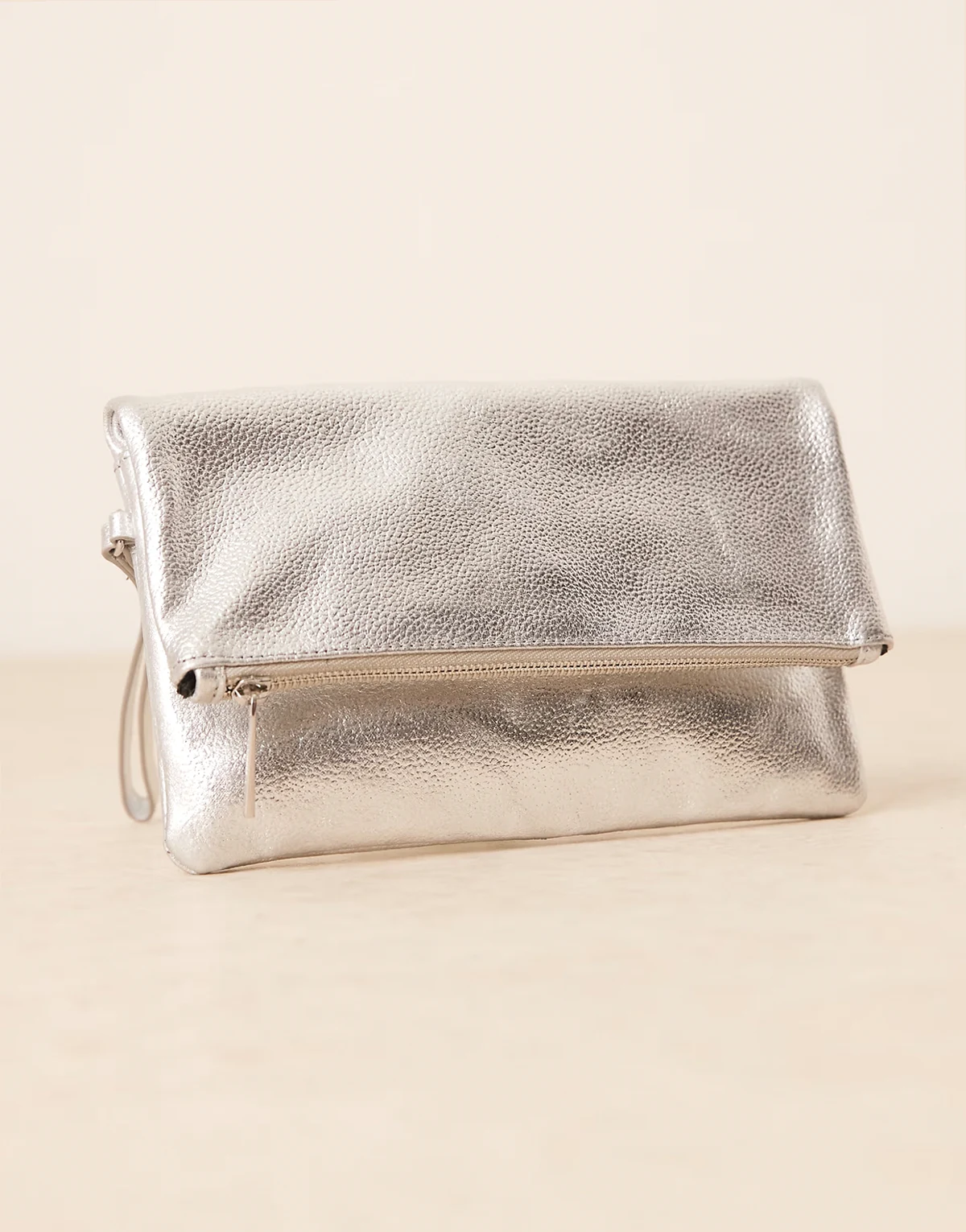– Srebrna metaliczna kopertówka skórzana z klapką