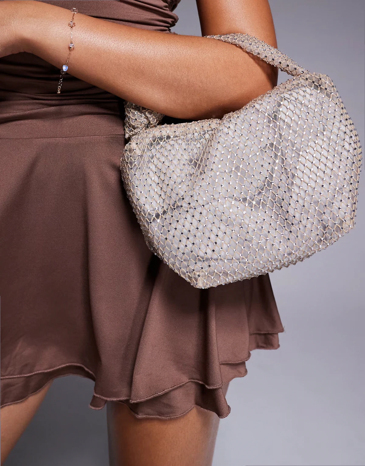 – Jasnoróżowa zaokrąglona torebka z kryształkami
