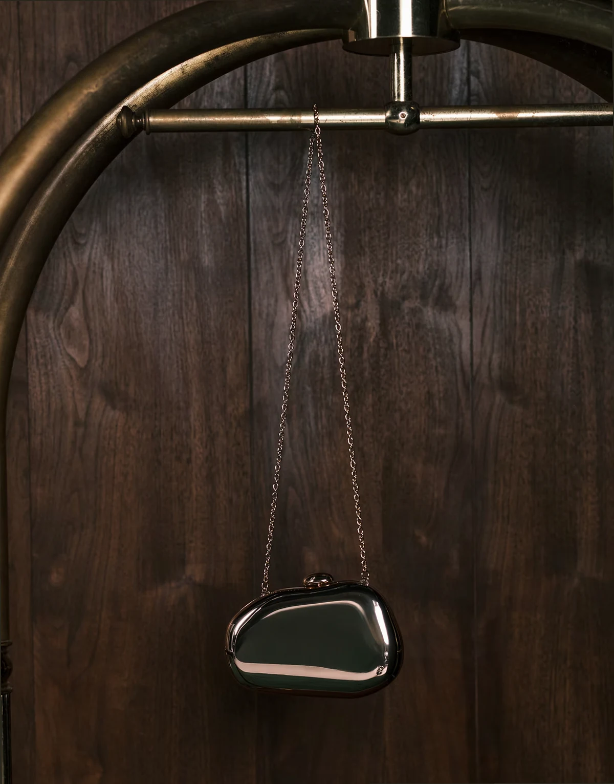 – Złota pudełkowa kopertówka o abstrakcyjnym kształcie z łańcuszkiem crossbody